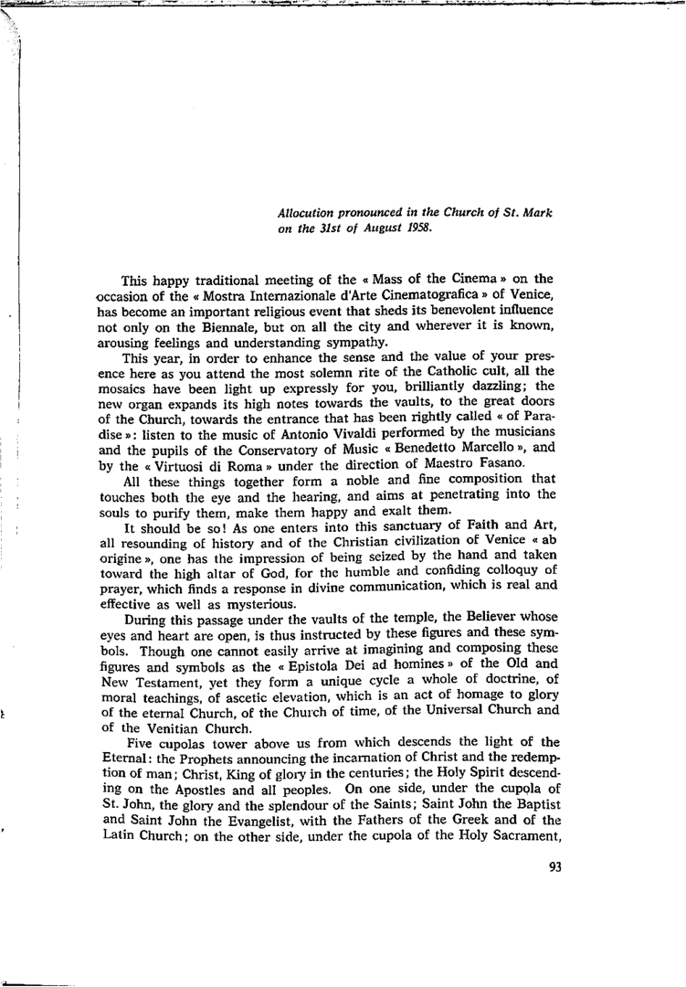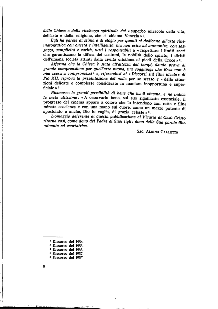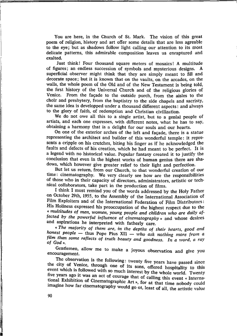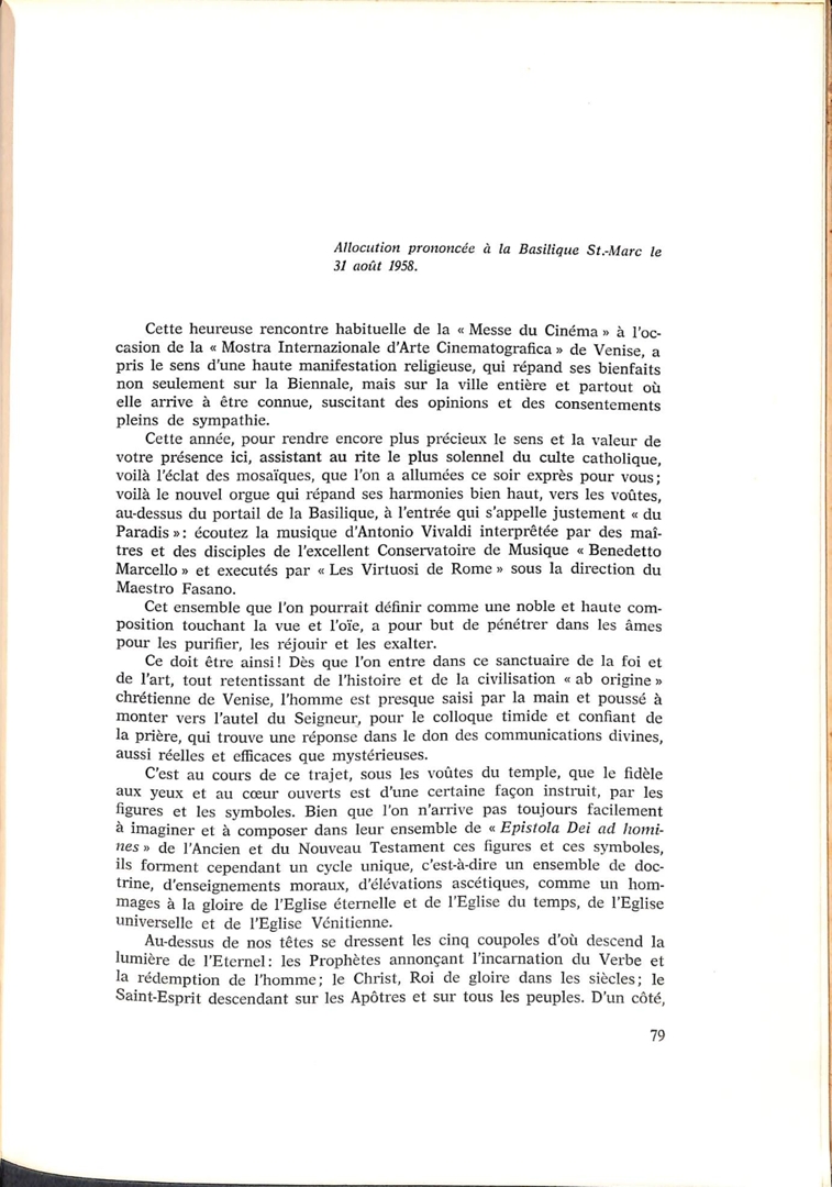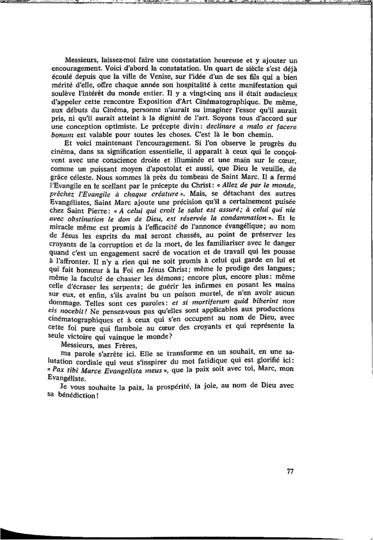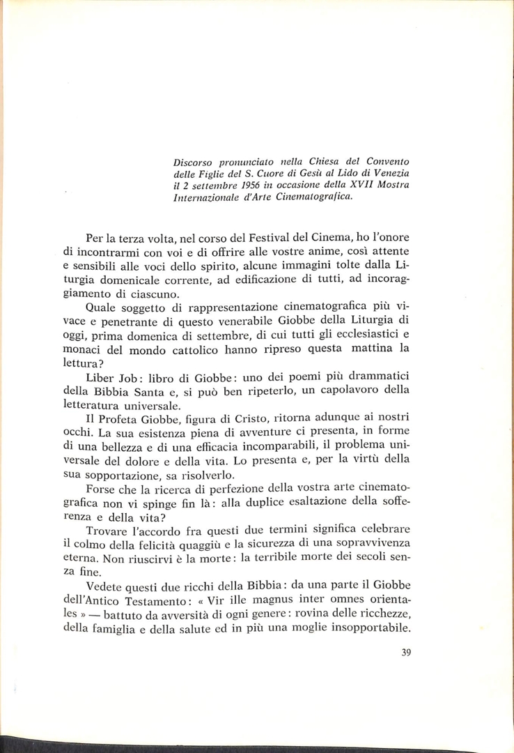 Il documento รจ un solenne omaggio a Giovanni XXIII e al suo rapporto con il cinema negli anni da cardinale e da patriarca di Venezia redatto dagli esponenti della Mostra Internazionale d'Arte Cinematografica di Venezia, dell'Associazione Nazionale Industrie Cinematografiche e Affini (ANICA) e dell'Associazione Generala Italiana dello Spettacolo (AGIS), i quali hanno collezionato nel volume i discorsi sul cinema tenuti da Roncalli nel periodo compreso tra il 1953 e il 1958.