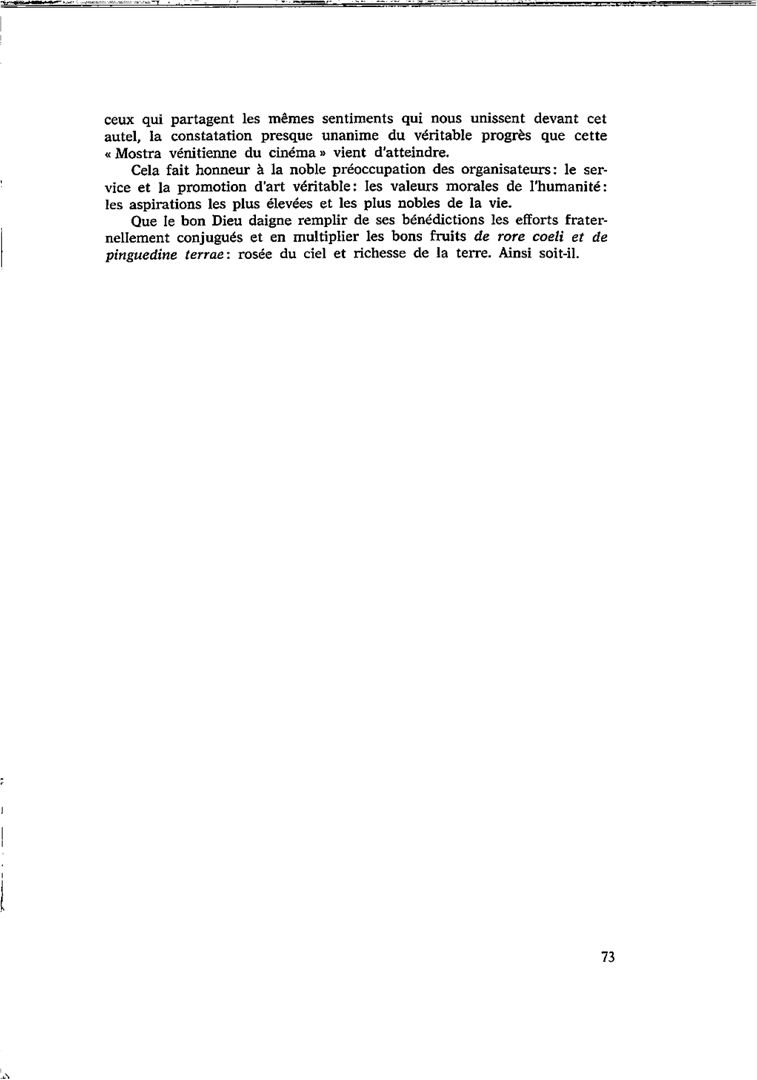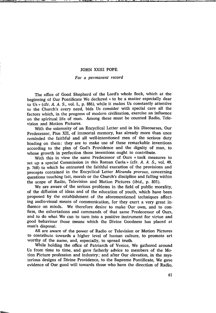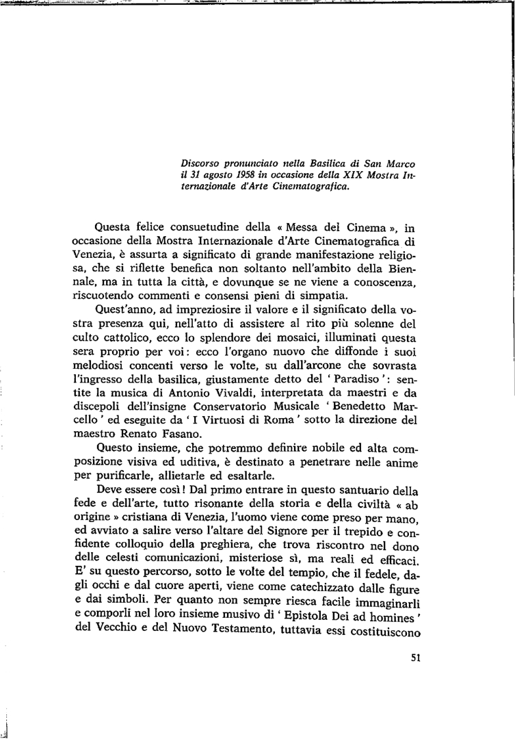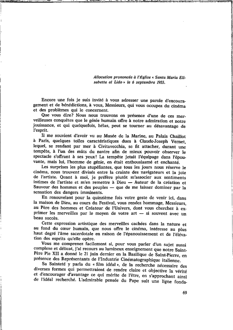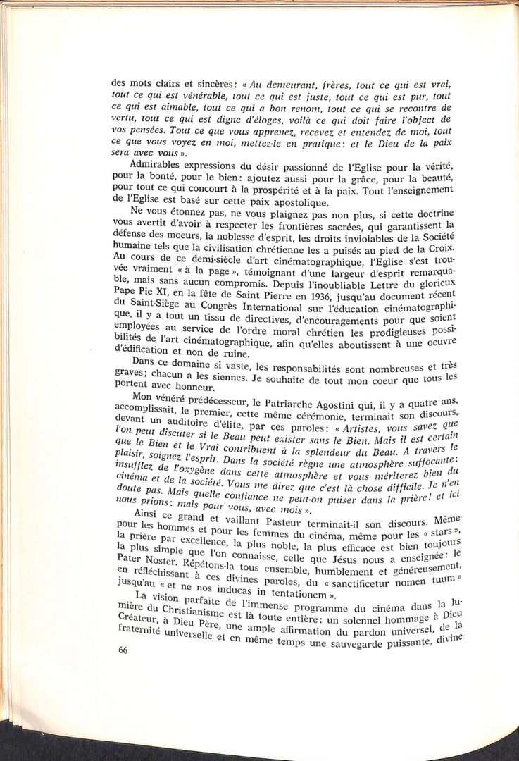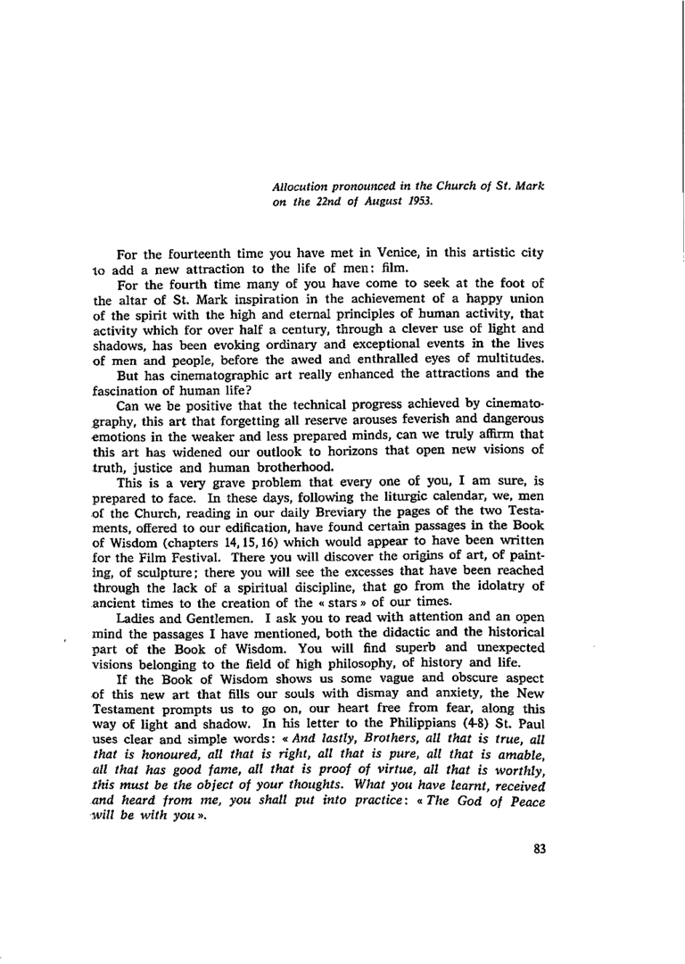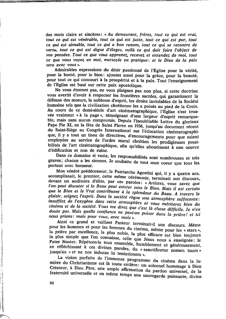 Il documento รจ un solenne omaggio a Giovanni XXIII e al suo rapporto con il cinema negli anni da cardinale e da patriarca di Venezia redatto dagli esponenti della Mostra Internazionale d'Arte Cinematografica di Venezia, dell'Associazione Nazionale Industrie Cinematografiche e Affini (ANICA) e dell'Associazione Generala Italiana dello Spettacolo (AGIS), i quali hanno collezionato nel volume i discorsi sul cinema tenuti da Roncalli nel periodo compreso tra il 1953 e il 1958.