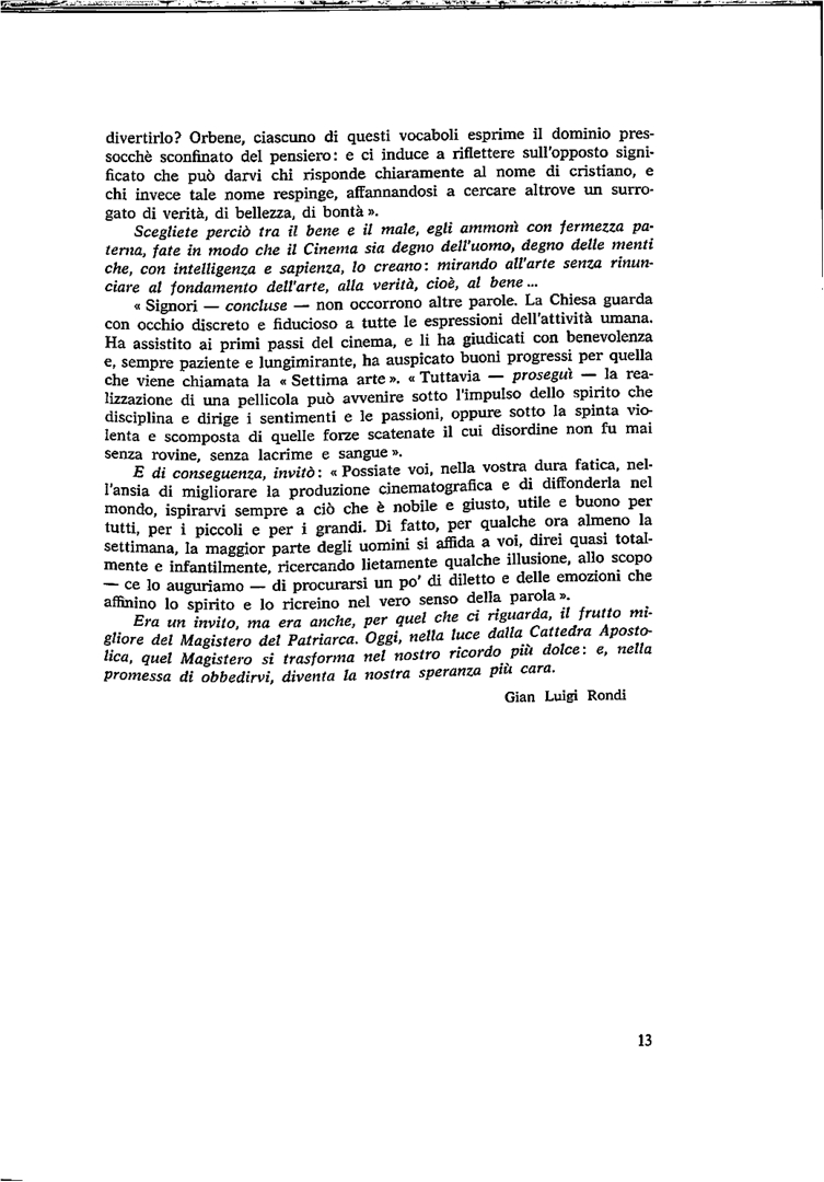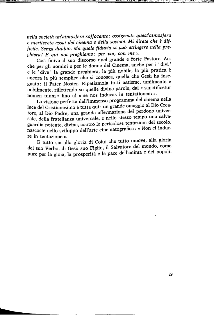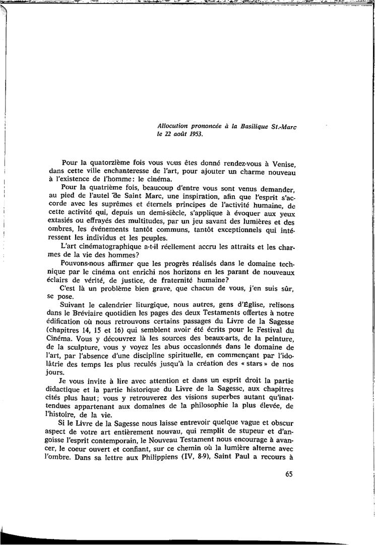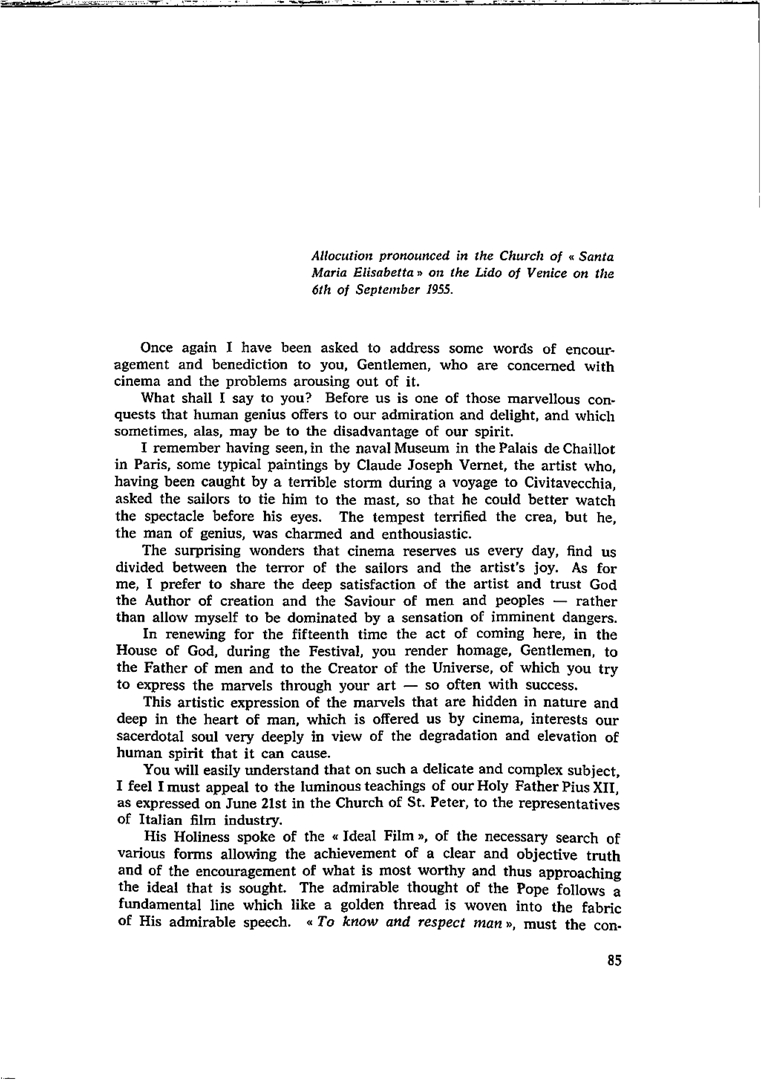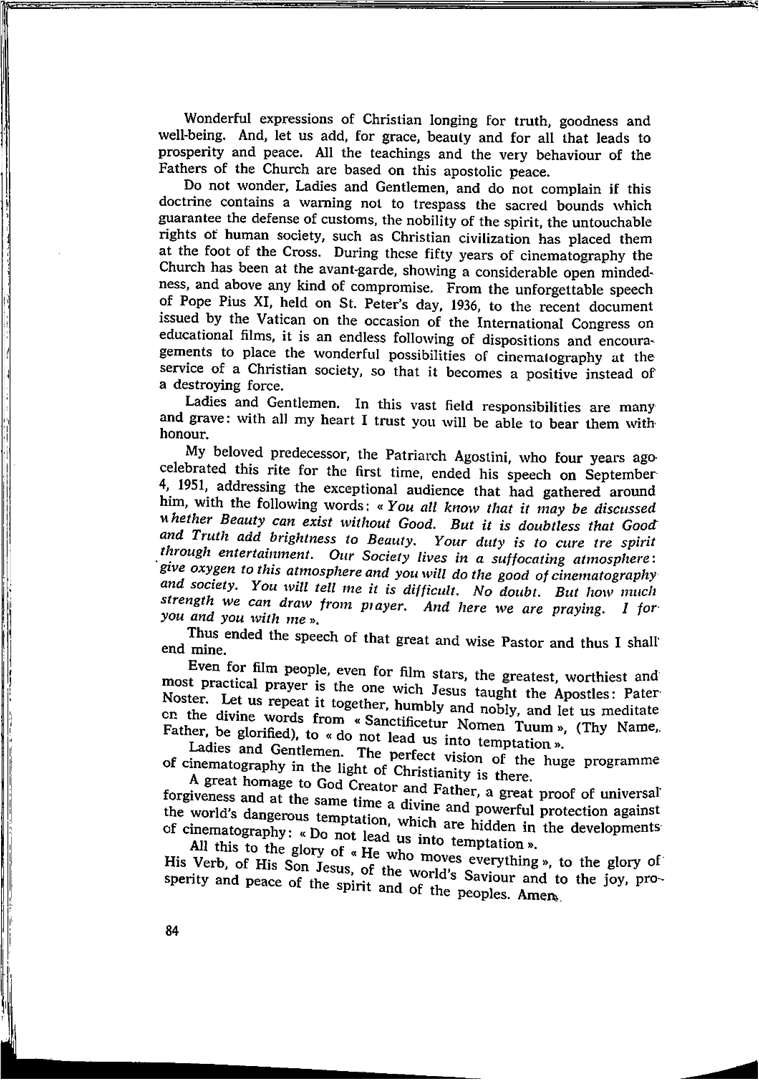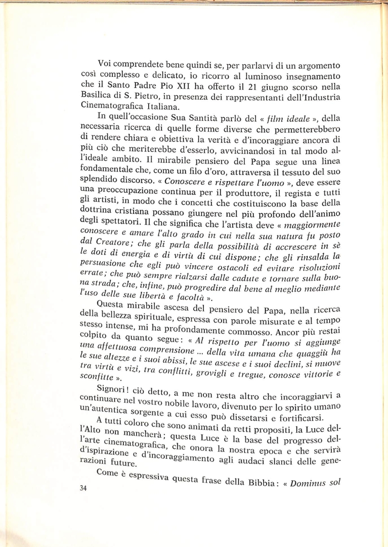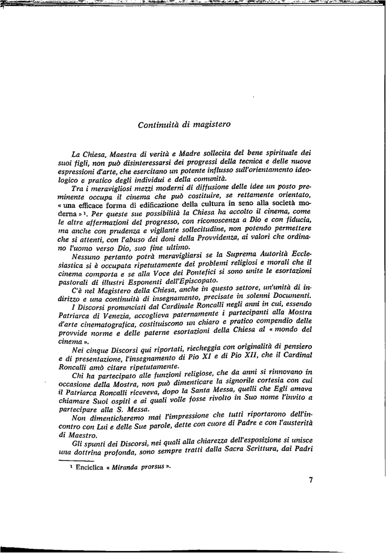 Il documento รจ un solenne omaggio a Giovanni XXIII e al suo rapporto con il cinema negli anni da cardinale e da patriarca di Venezia redatto dagli esponenti della Mostra Internazionale d'Arte Cinematografica di Venezia, dell'Associazione Nazionale Industrie Cinematografiche e Affini (ANICA) e dell'Associazione Generala Italiana dello Spettacolo (AGIS), i quali hanno collezionato nel volume i discorsi sul cinema tenuti da Roncalli nel periodo compreso tra il 1953 e il 1958.