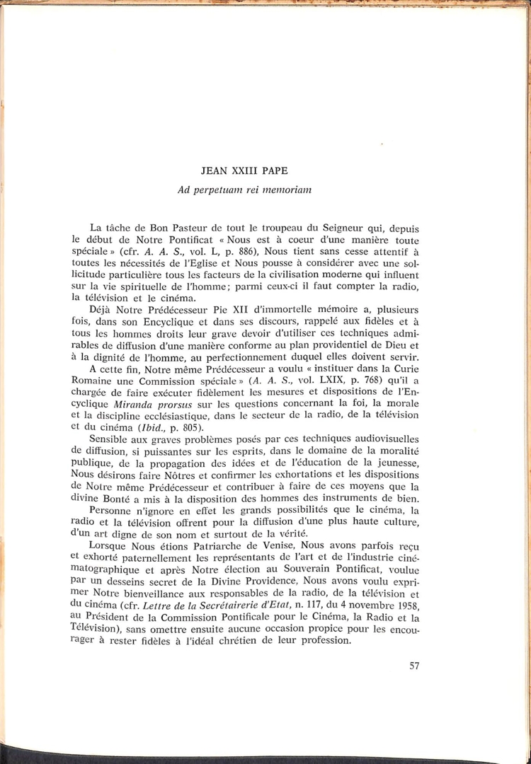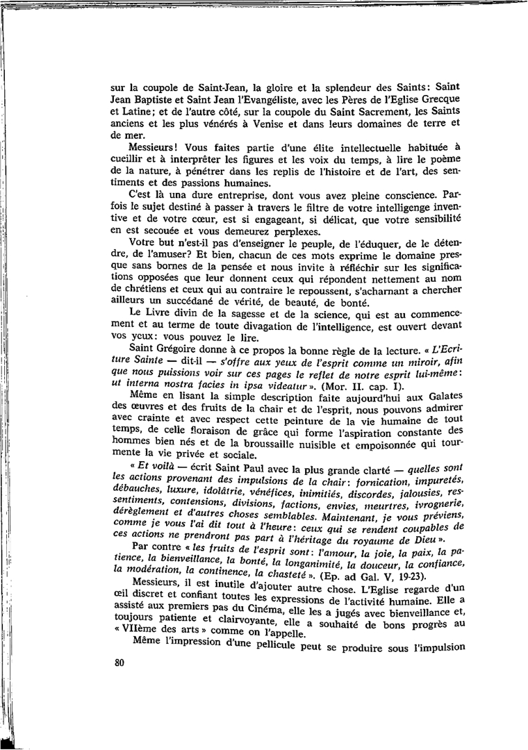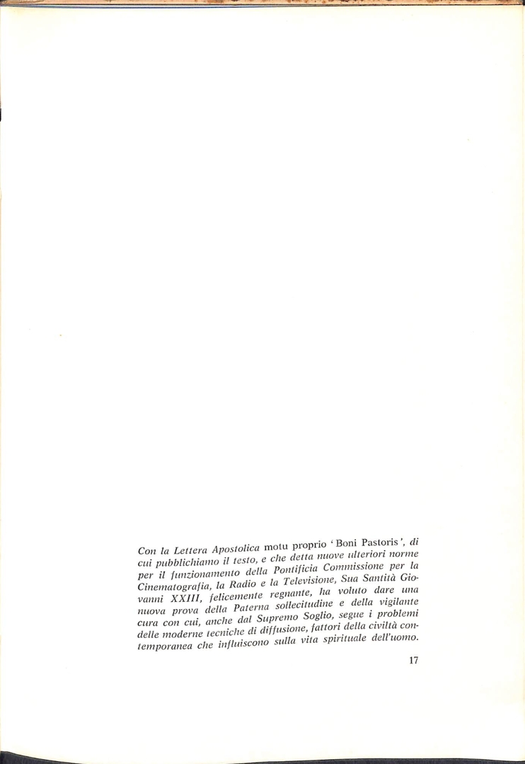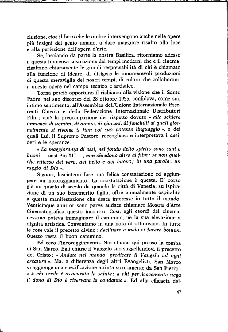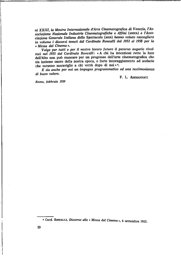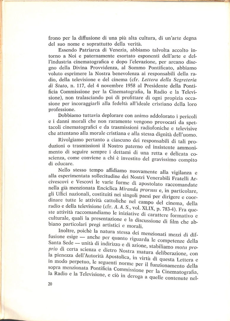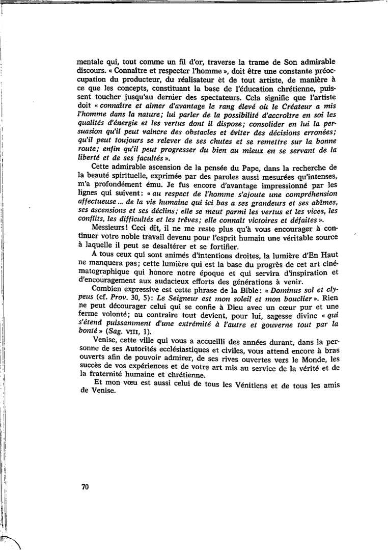 Il documento รจ un solenne omaggio a Giovanni XXIII e al suo rapporto con il cinema negli anni da cardinale e da patriarca di Venezia redatto dagli esponenti della Mostra Internazionale d'Arte Cinematografica di Venezia, dell'Associazione Nazionale Industrie Cinematografiche e Affini (ANICA) e dell'Associazione Generala Italiana dello Spettacolo (AGIS), i quali hanno collezionato nel volume i discorsi sul cinema tenuti da Roncalli nel periodo compreso tra il 1953 e il 1958.