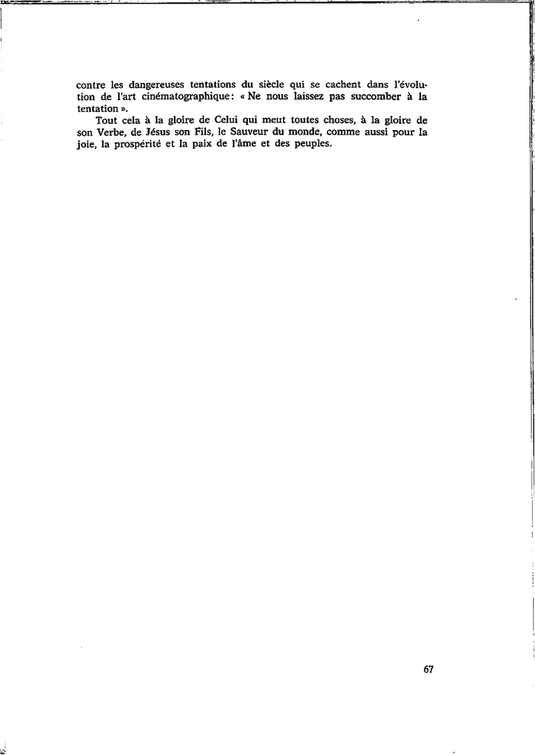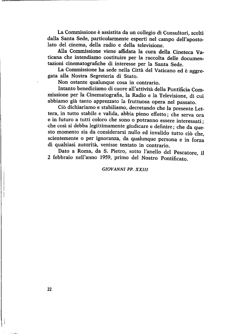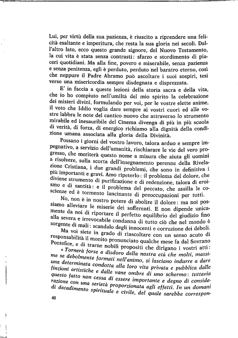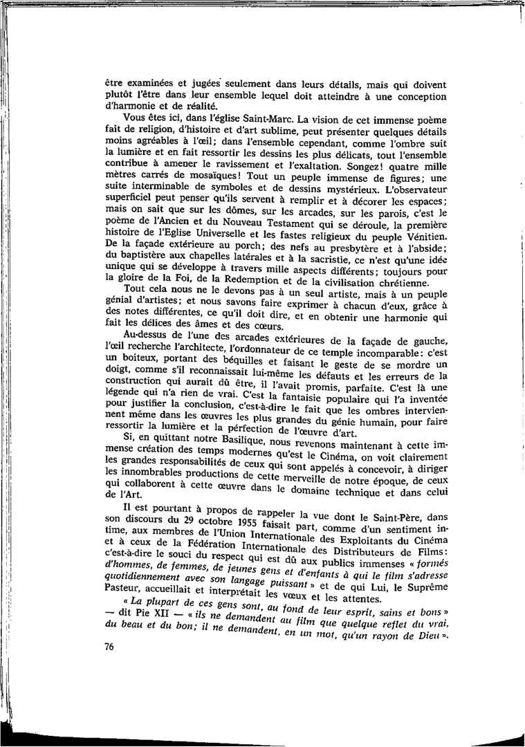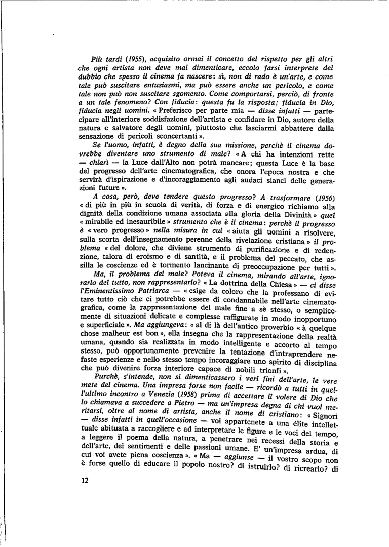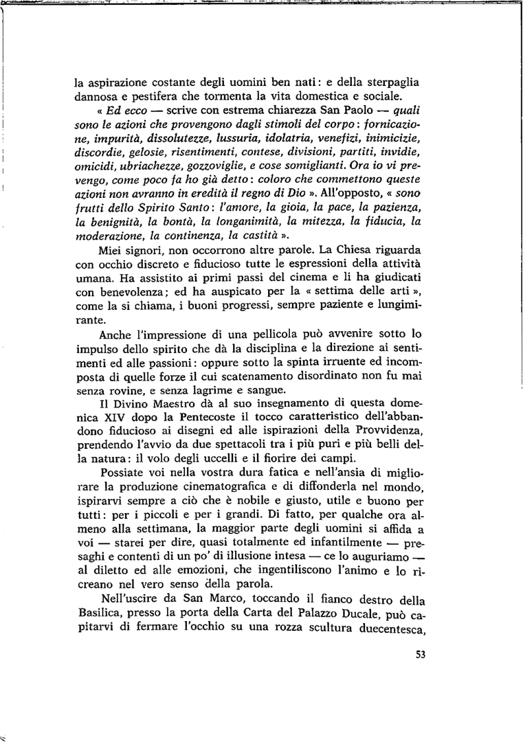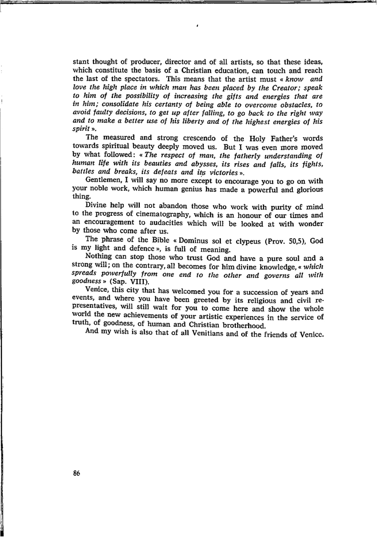Il documento รจ un solenne omaggio a Giovanni XXIII e al suo rapporto con il cinema negli anni da cardinale e da patriarca di Venezia redatto dagli esponenti della Mostra Internazionale d'Arte Cinematografica di Venezia, dell'Associazione Nazionale Industrie Cinematografiche e Affini (ANICA) e dell'Associazione Generala Italiana dello Spettacolo (AGIS), i quali hanno collezionato nel volume i discorsi sul cinema tenuti da Roncalli nel periodo compreso tra il 1953 e il 1958.