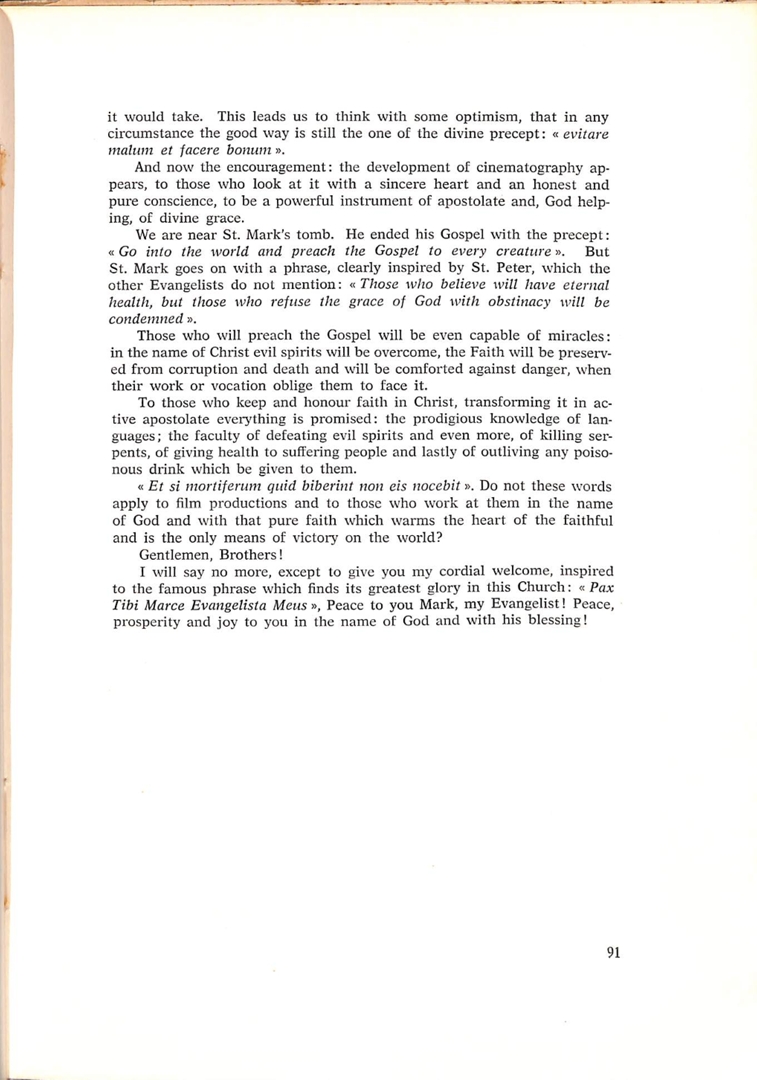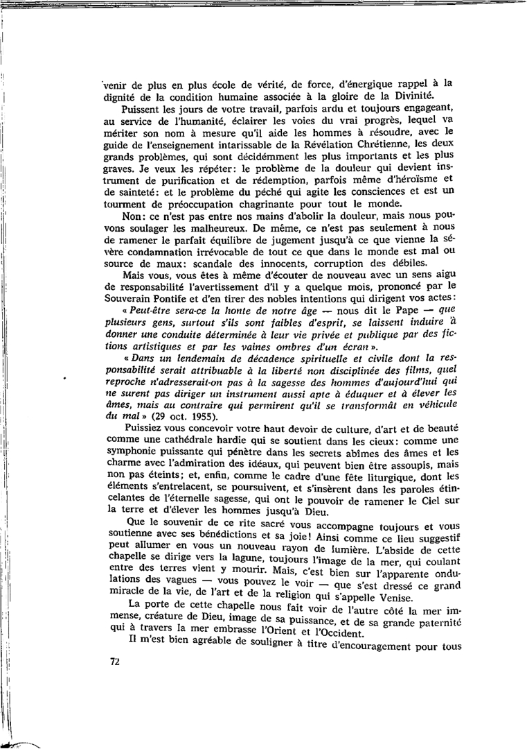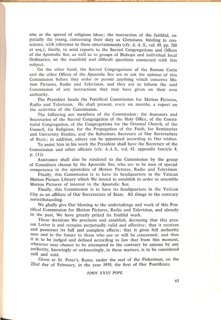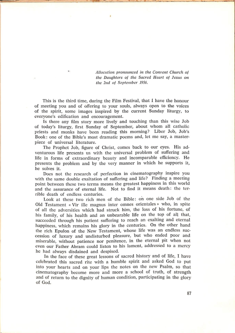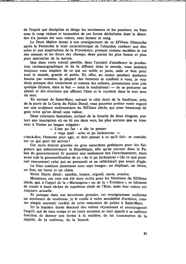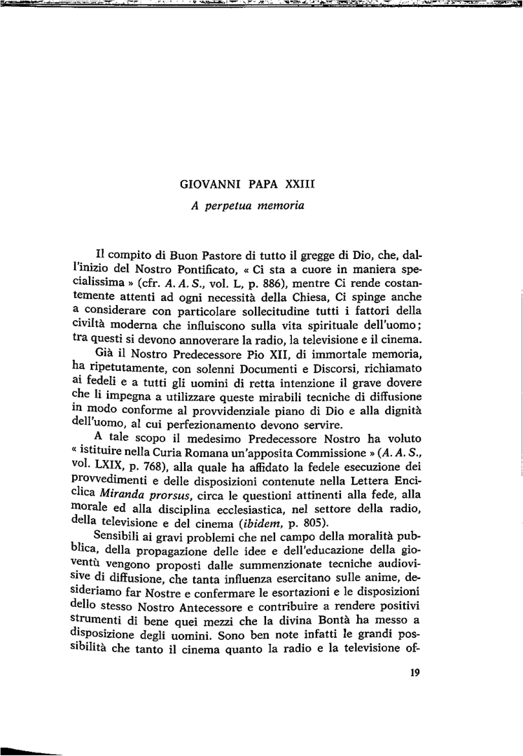 Il documento รจ un solenne omaggio a Giovanni XXIII e al suo rapporto con il cinema negli anni da cardinale e da patriarca di Venezia redatto dagli esponenti della Mostra Internazionale d'Arte Cinematografica di Venezia, dell'Associazione Nazionale Industrie Cinematografiche e Affini (ANICA) e dell'Associazione Generala Italiana dello Spettacolo (AGIS), i quali hanno collezionato nel volume i discorsi sul cinema tenuti da Roncalli nel periodo compreso tra il 1953 e il 1958.