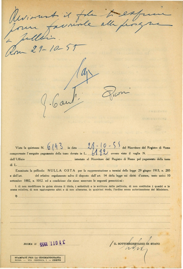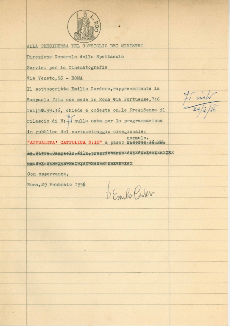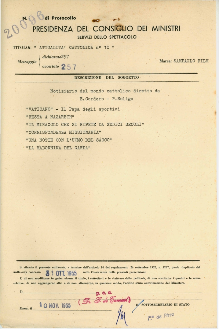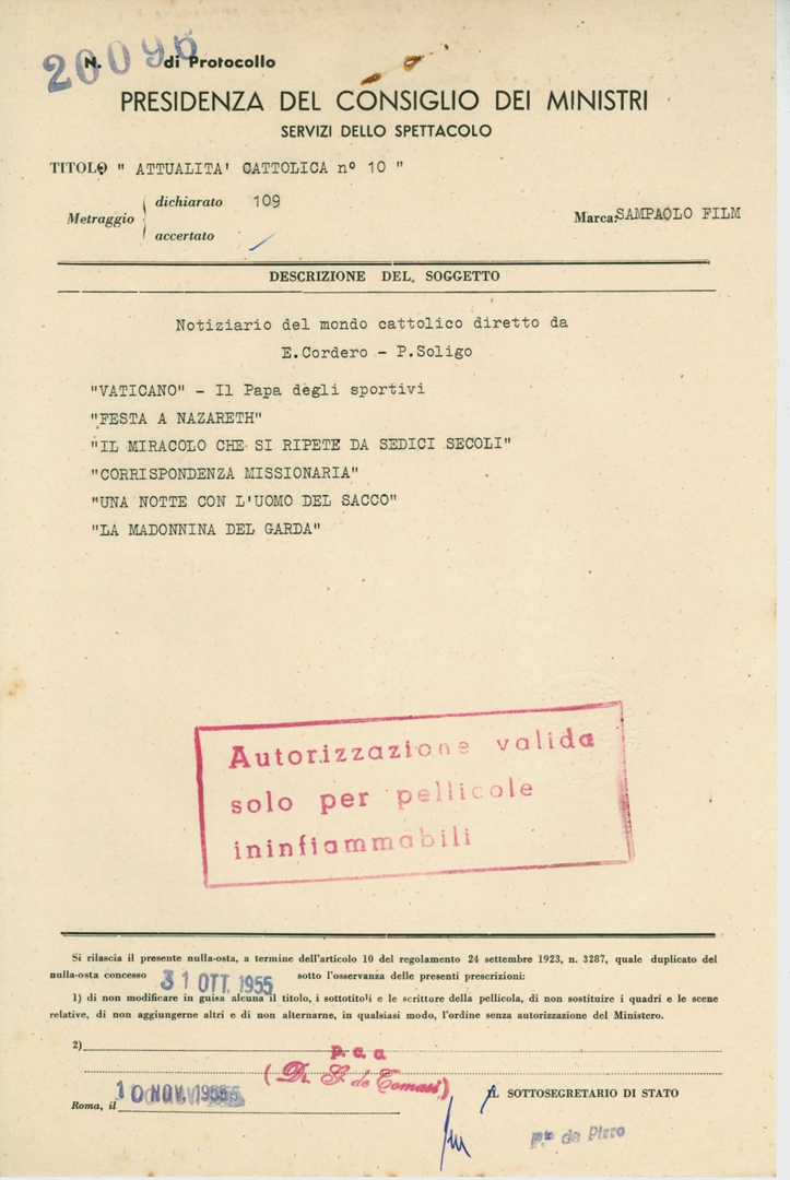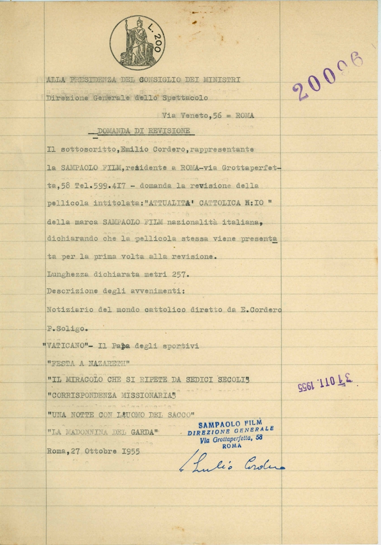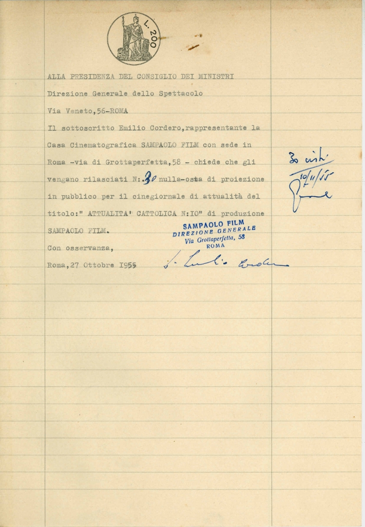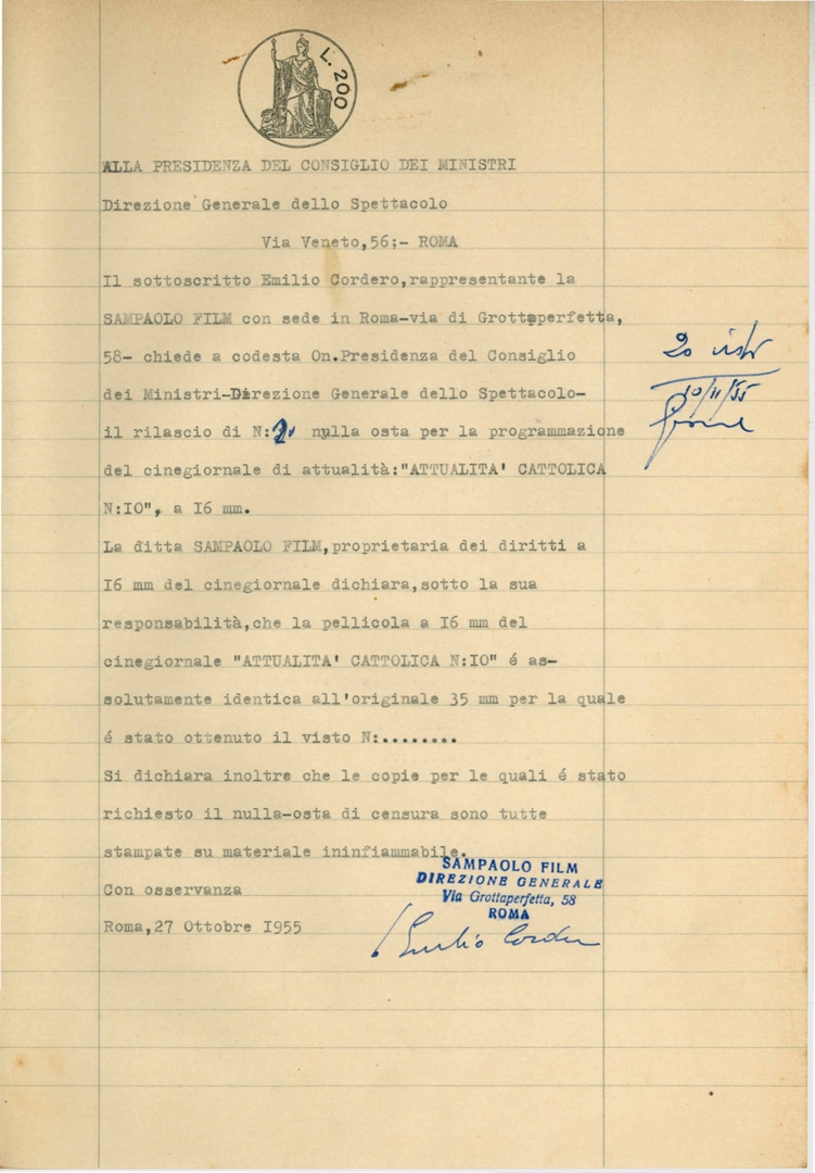 Allegata nota della San Paolo Film, a firma di Emilio Cordero, indirizzata alla Direzione generale dello spettacolo del 27 ottobre 1955, in cui si dichiara che i primi nove numeri del cinegiornale "Attualità cattolica" sono stati editi a scopo sperimentale e non stati immessi nei circuiti di distribuzione industriale e parrocchiale