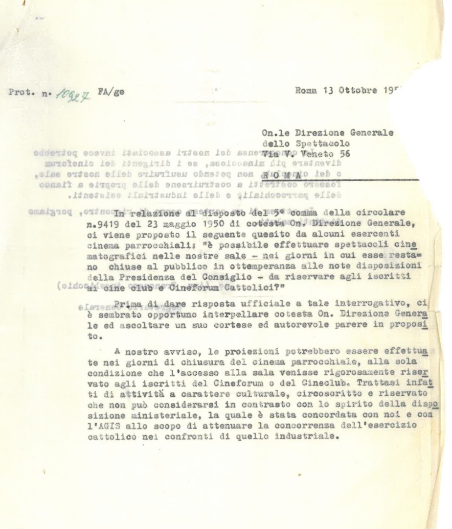 Lettera di Vincenzo Barattolo, presidente dell'Associazione generale italiana dello spettacolo - AGIS, a mons. Francesco Dalla Zuanna, presidente dell'ACEC