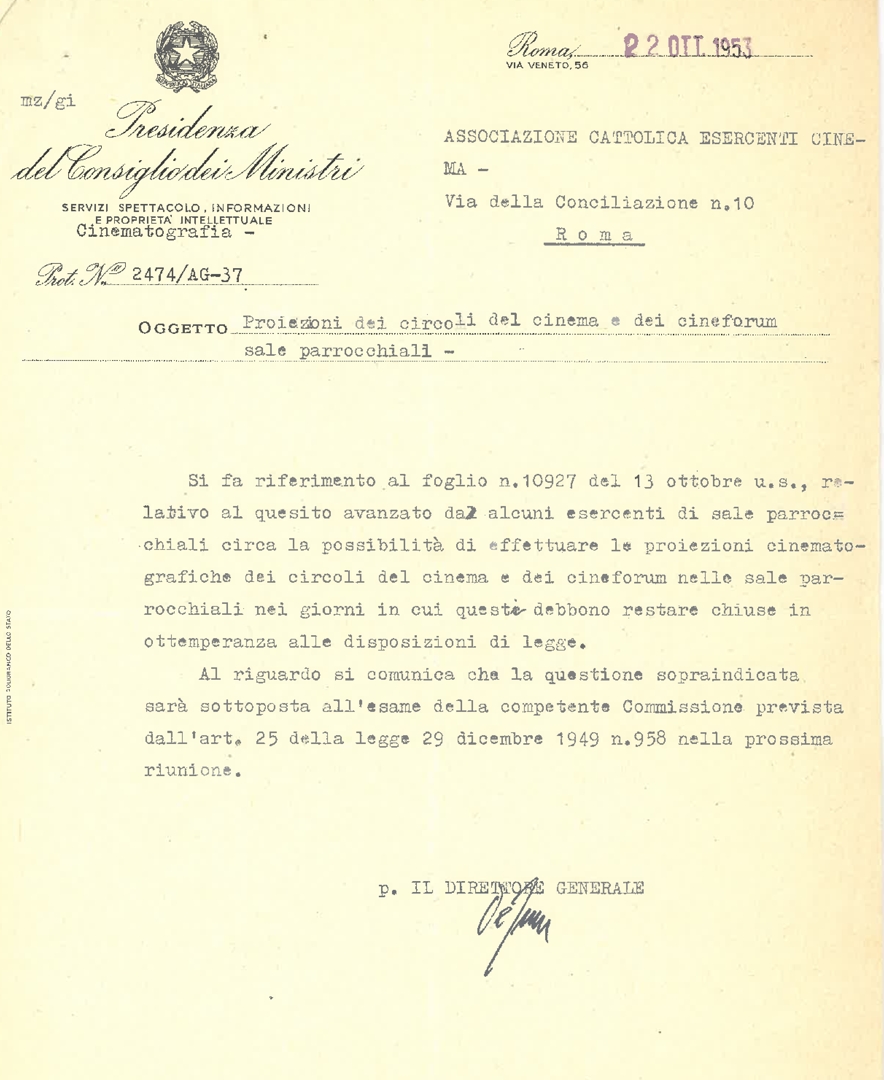 Lettera dell'on. Giuseppe Brusasca, sottosegretario di Stato allo spettacolo, al Centro cattolico cinematografico - CCC