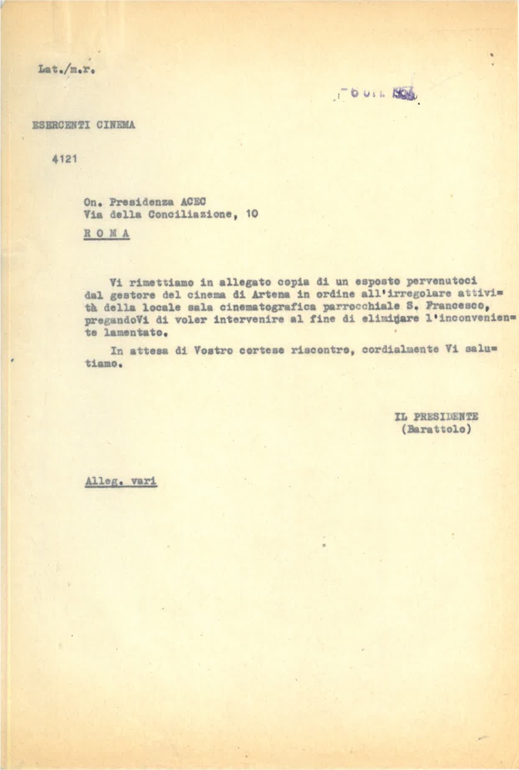 Lettera di Vincenzo Barattolo, presidente Esercenti Cinema, alla Direzione del cinema Artena dell'omonimo comune in provincia di Roma