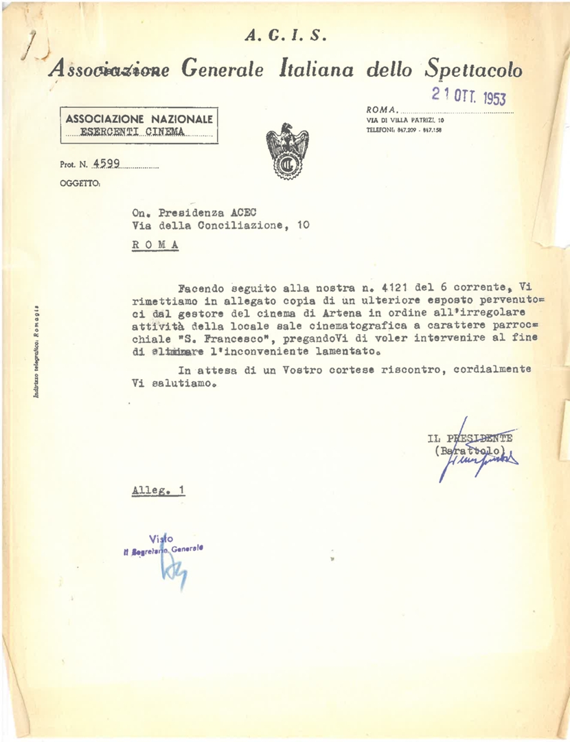 Lettera della direzione del cinema di Artena in provincia di Roma, a firma di Lino Elio Valenti, alla presidenza dell'Associazione generale italiana dello spettacolo - AGIS