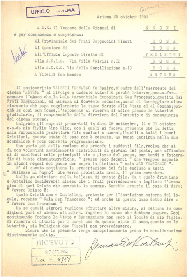 Lettera della Direzione del cinema di Artena in provincia di Roma, a firma di Fernando Valenti, padre dell'esercente il cinema, al vescovo della diocesi di Segni in provincia di Roma
