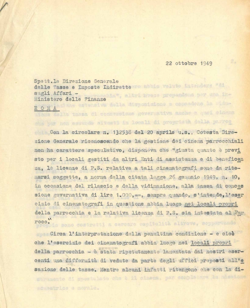 Lettera dell'ing. Ugo Sciascia, segretario generale dell'Ente dello spettacolo, alla Direzione generale delle tasse e imposte indirette sugli affari del ministero delle finanze