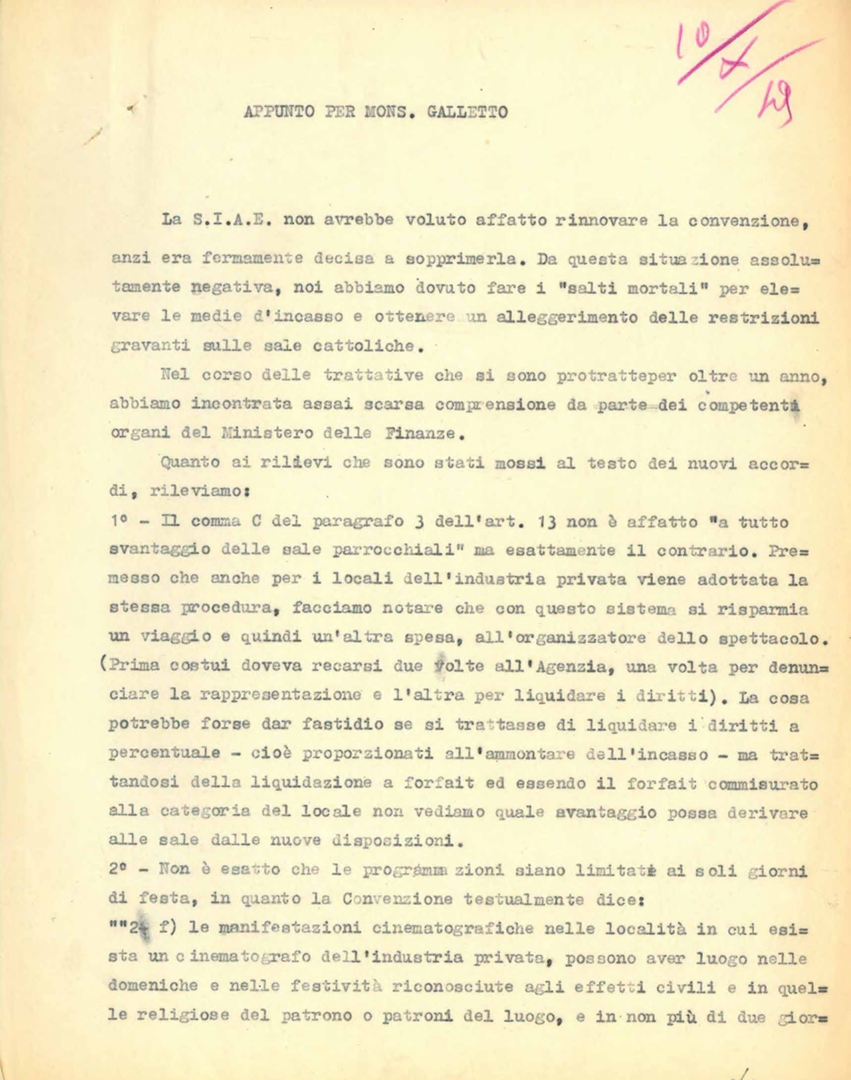 Lettera di Italo Gemini, presidente dell'Associazione generale italiana dello spettacolo - AGIS, al Centro cattolico cinematografico - CCC