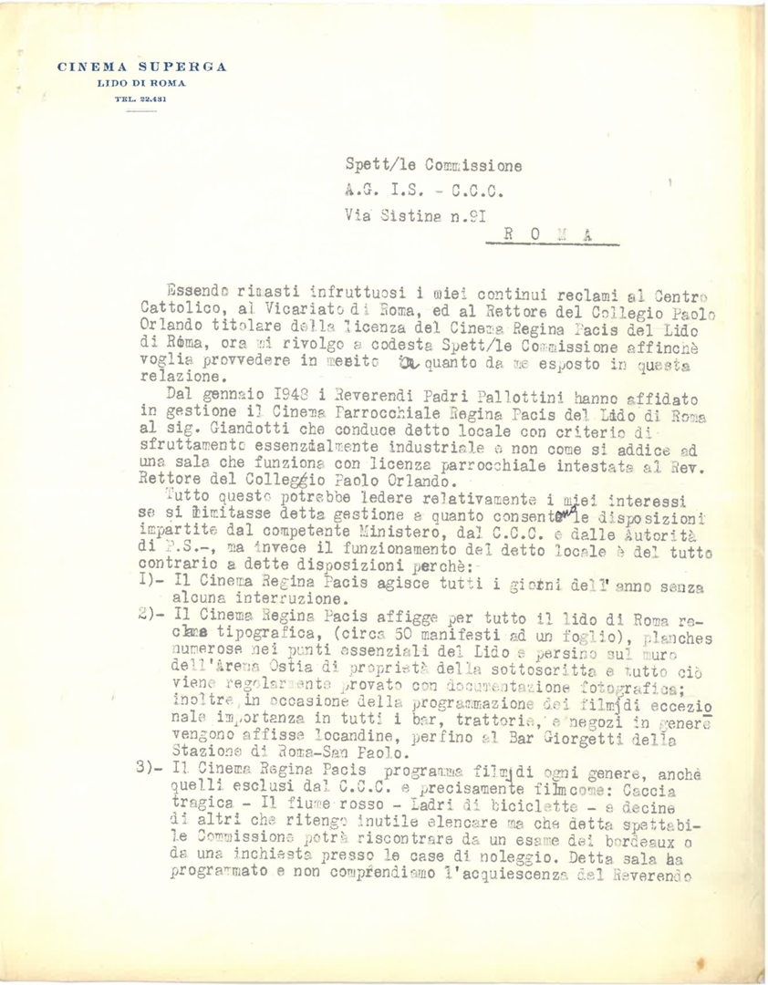 Lettera di Claretto Caterina della direzione del cinema Superga del Lido di Roma alla Commissione arbitrale nazionale AGIS e CCC