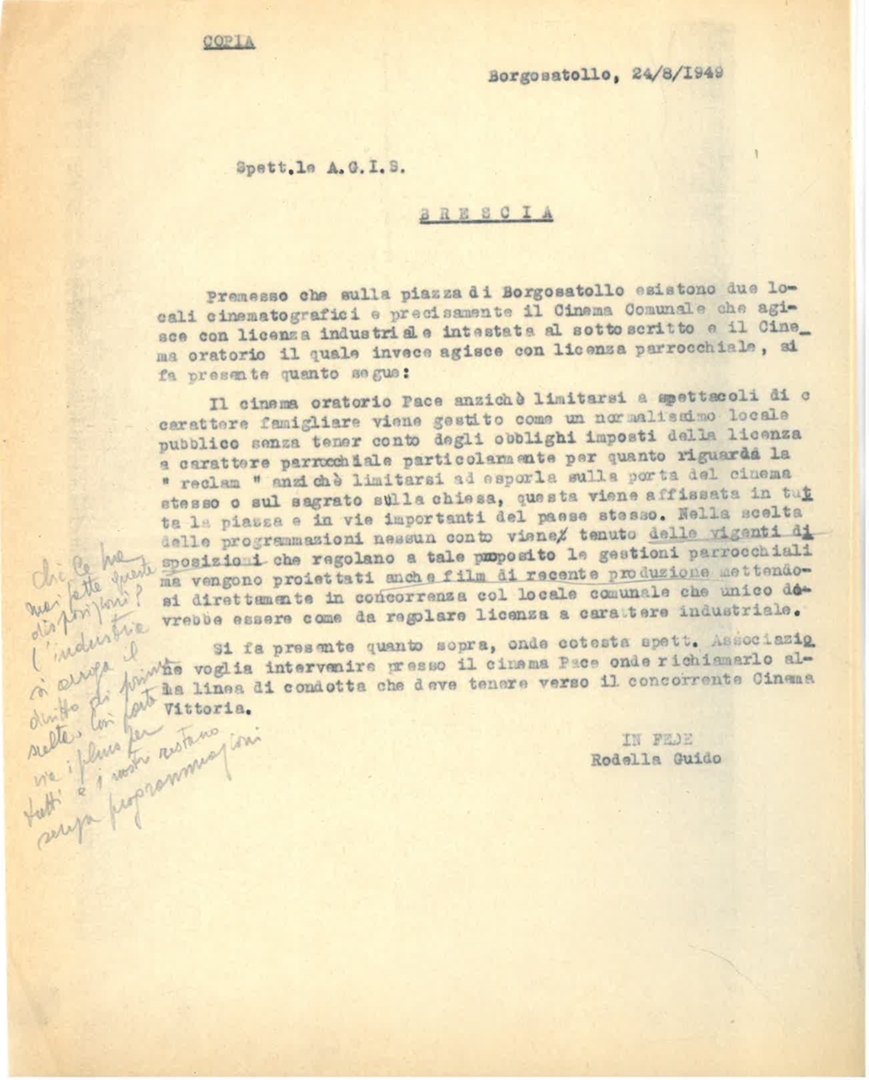 Lettera della direzione del cinema comunale di Borgosatollo in provincia di Brescia, a firma di Guido Rodella, all'Associazione generale italiana dello spettacolo - AGIS