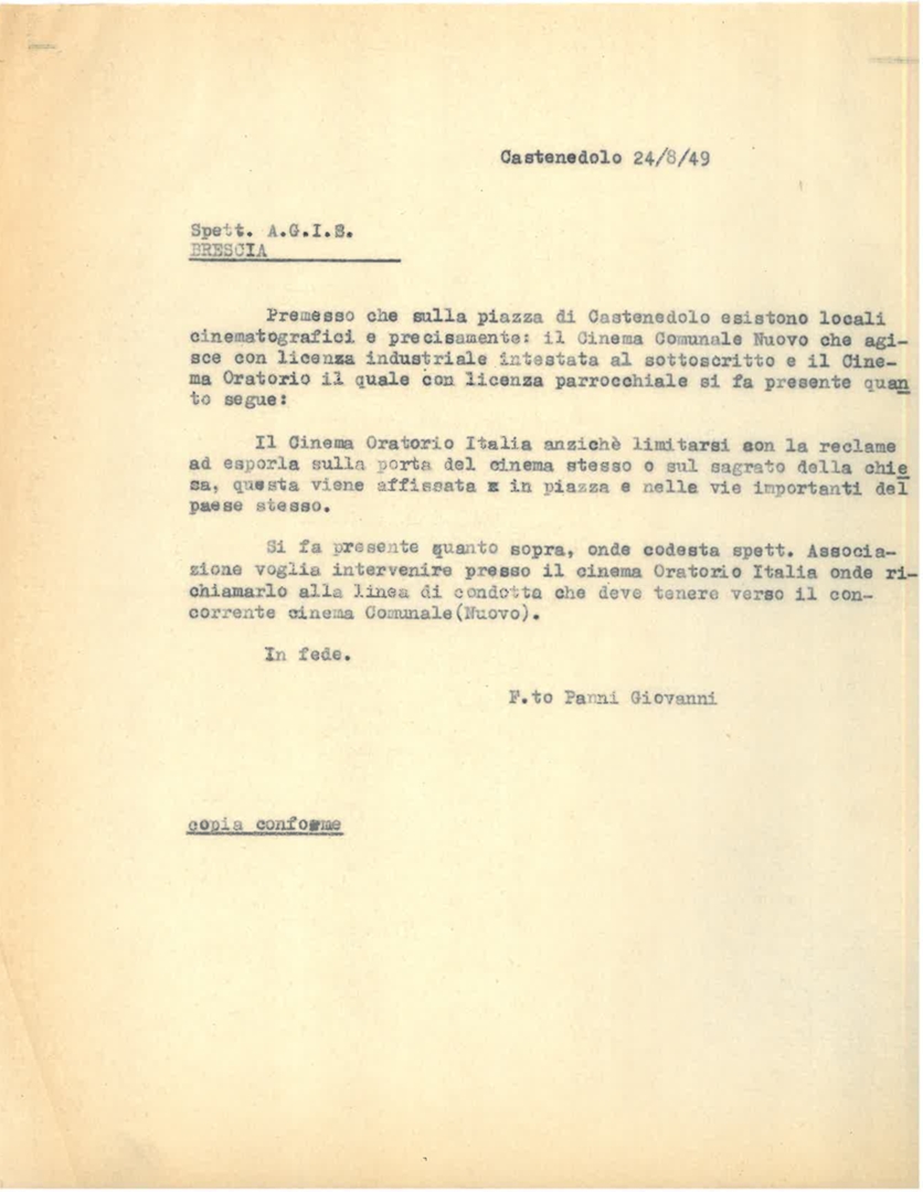 Lettera della direzione del cinema comunale di Castenedolo in provincia di Brescia, a firma di Giovanni Panni. all'Associazione generale italiana dello spettacolo - AGIS