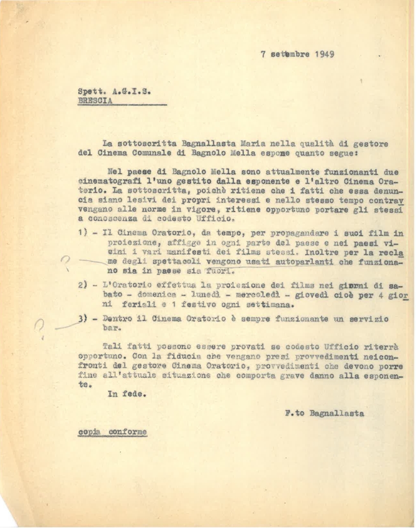Lettera della direzione del cinema comunale di Bagnolo Mella in provincia di Brescia, a firma di Maria Bagnallasta, all'Associazione generale italiana dello spettacolo - AGIS