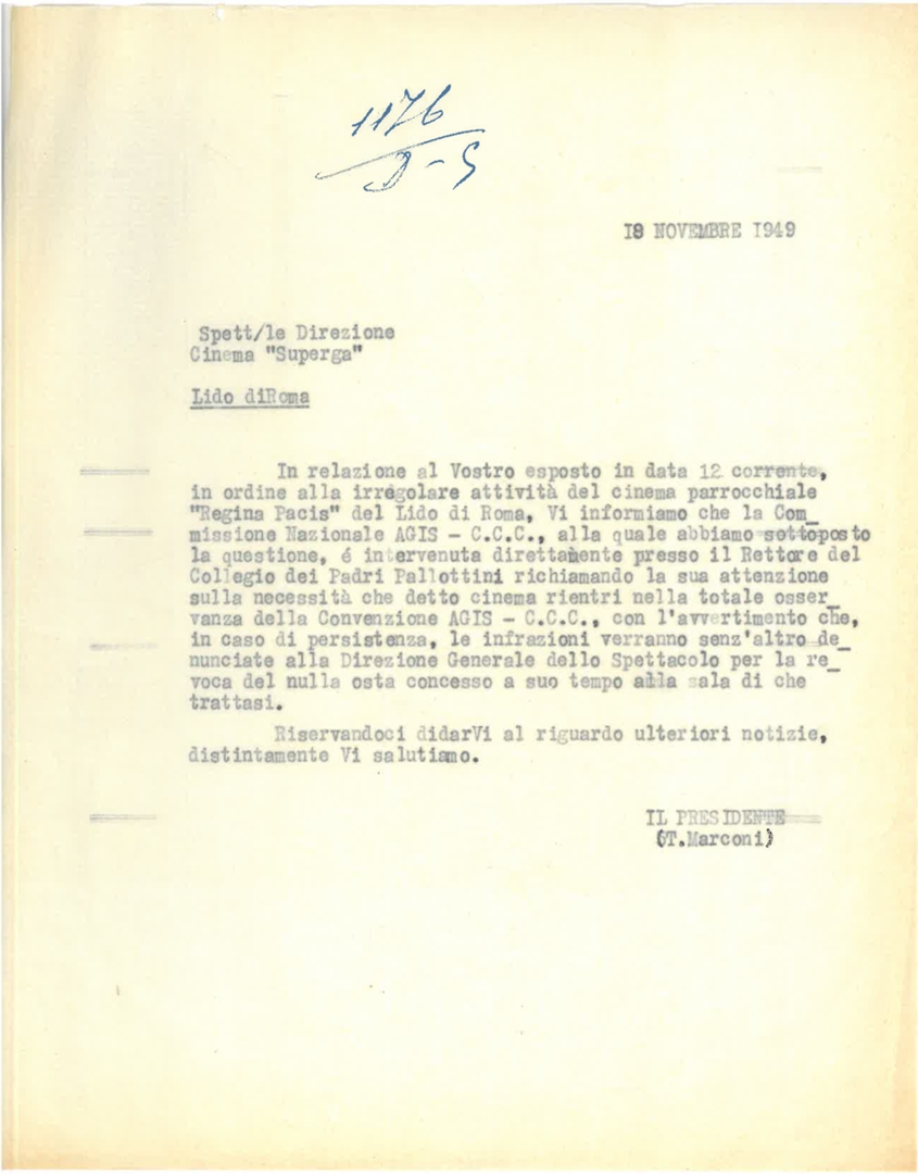 Lettera di T. Marconi, presidente dell'Associazione generale italiana dello spettacolo - AGIS, alla Direzione del cinema Superga del Lido di Roma