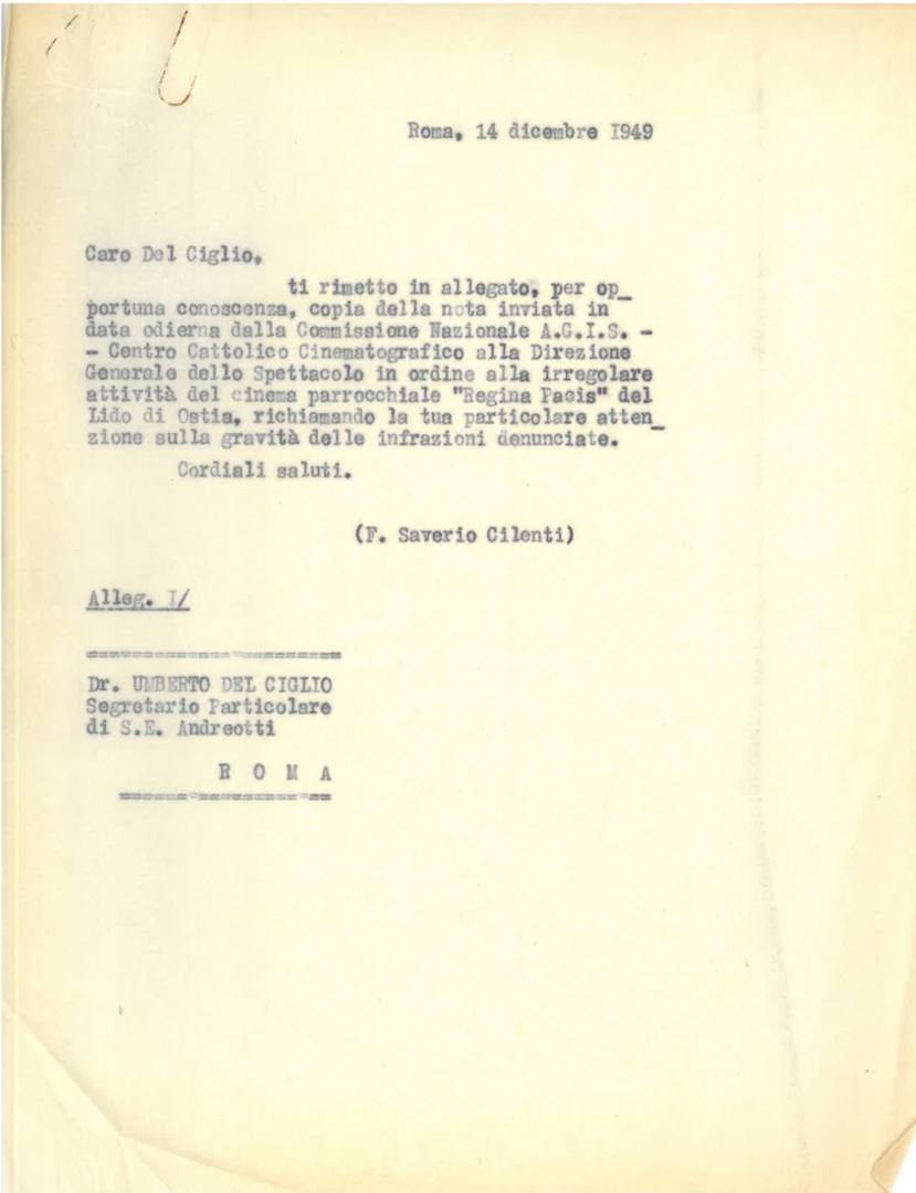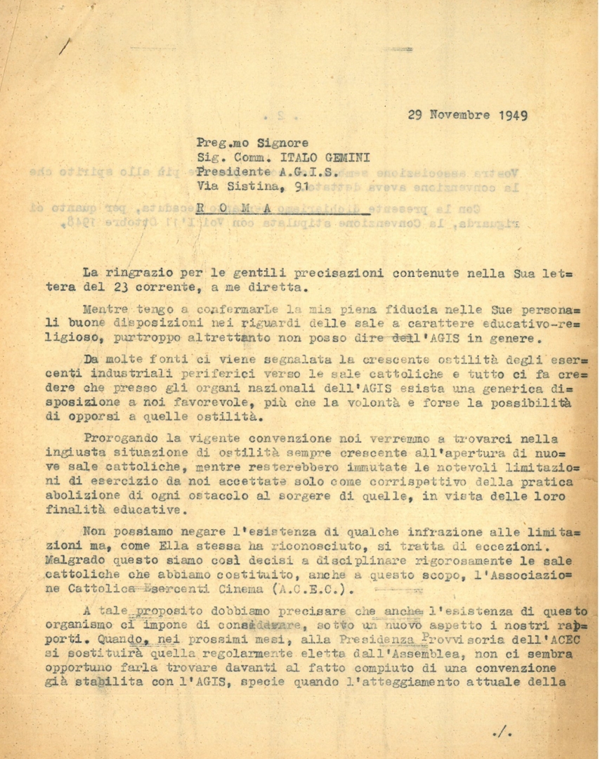 Lettera di Luigi Gedda, presidente generale dell'Azione cattolica Italiana - ACI, a Italo Gemini, presidente dell'Associazione generale italiana dello spettacolo - AGIS