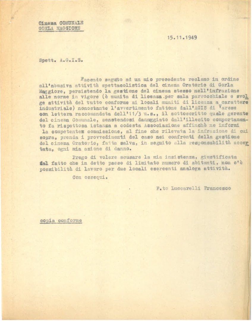 Lettera della direzione del cinema comunale di Gorla Maggiore in provincia di Varese, a firma di Francesco Luccarelli, all'Associazione generale italiana dello spettacolo - AGIS