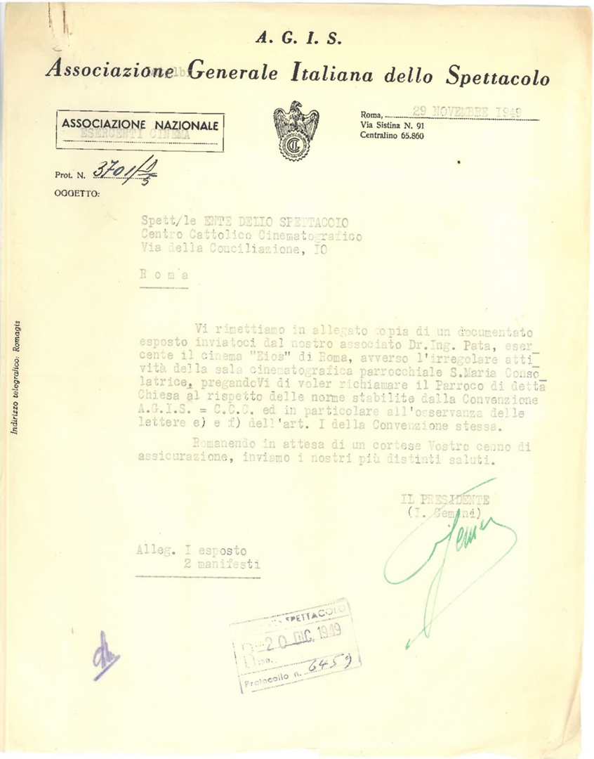 Lettera della direzione del cinema Elios di Roma, a firma di Vittorino Pata, all'Associazione generale italiana dello spettacolo - AGIS