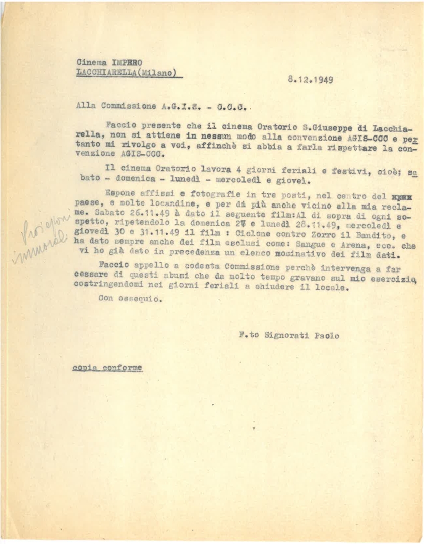 Lettera della Direzione Cinema Impero a firma di Paolo Signorati alla Commissione AGIS - CCC