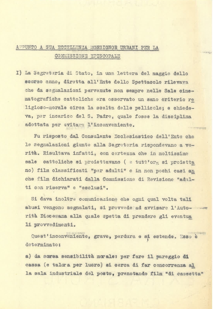 "Appunto a sua eccellenza mons. Urbani per la Commissione episcopale"