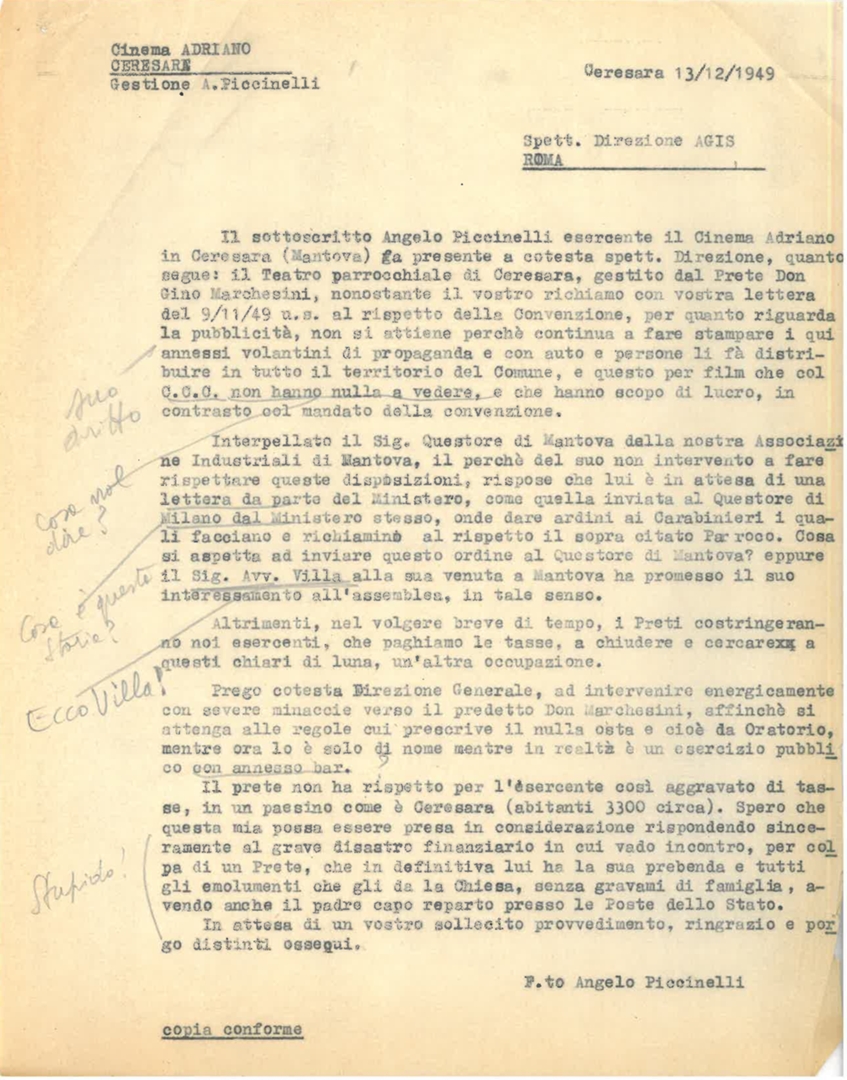 Lettera della direzione del cinema Adriano di Ceresara in provincia di Mantova, a firma di Angelo Piccinelli, all'Associazione generale italiana dello spettacolo - AGIS, Direzione di Roma