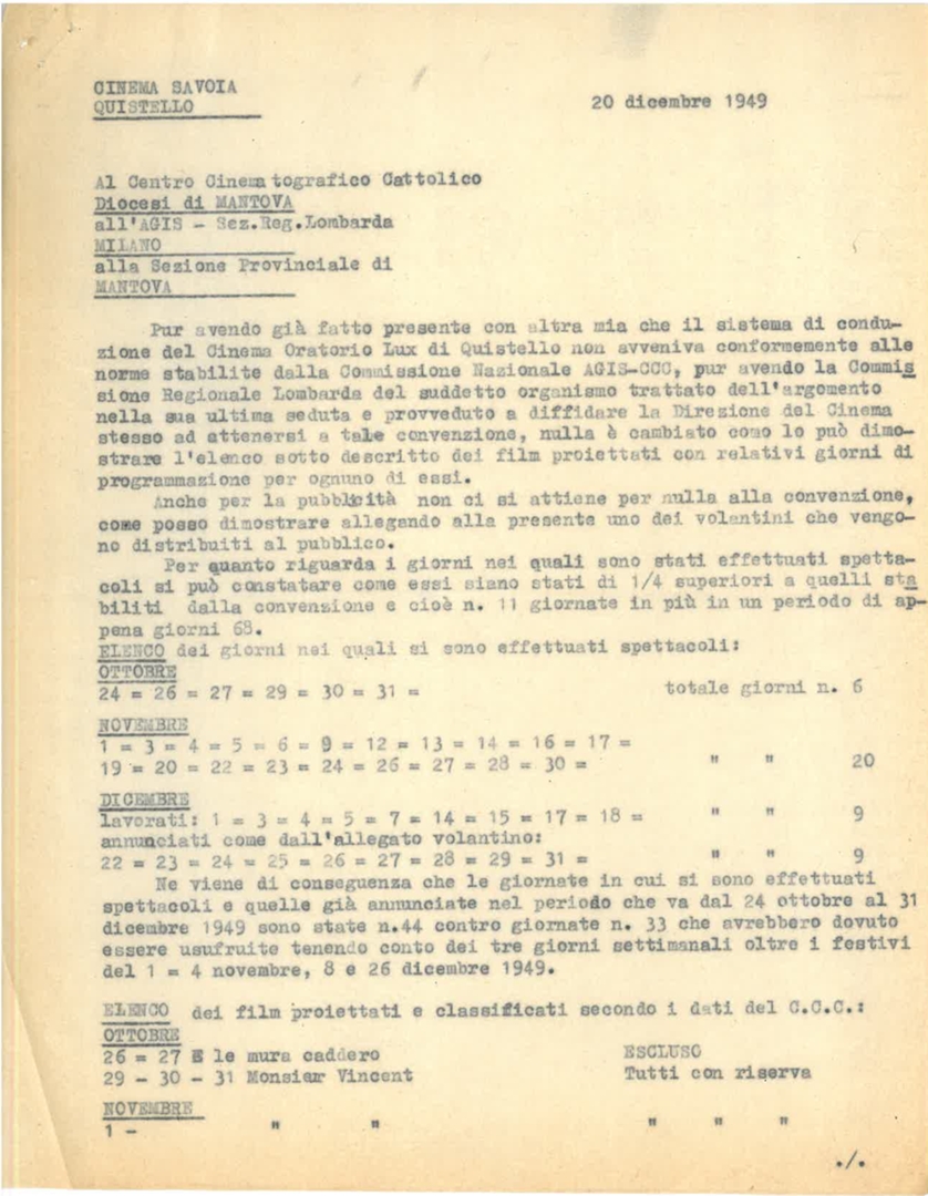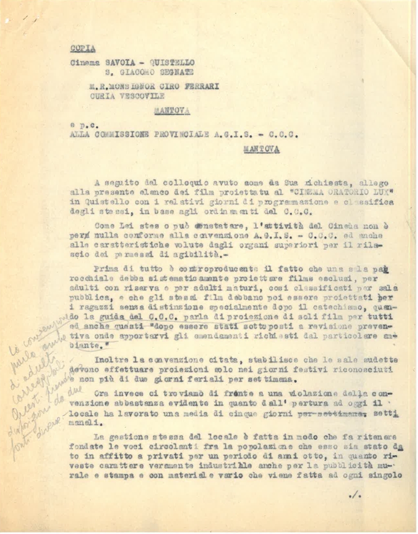 Lettera della direzione del cinema Savoia di Quistello in provincia di Mantova a mons. Ciro Ferrari della curia arcivescovile di Mantova