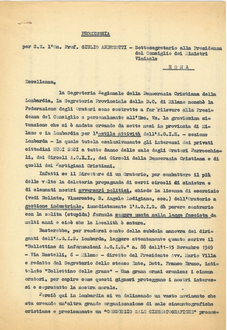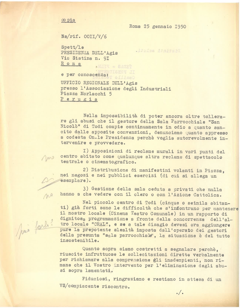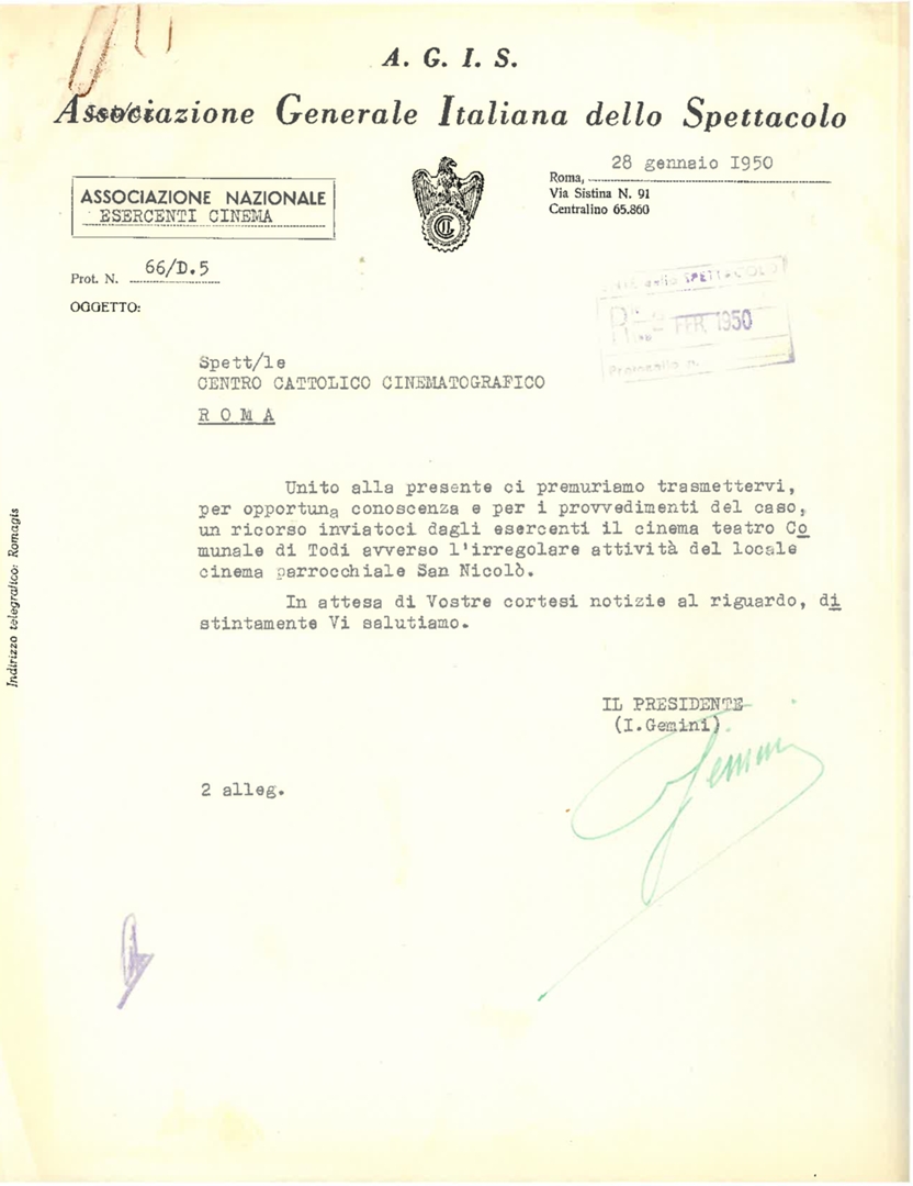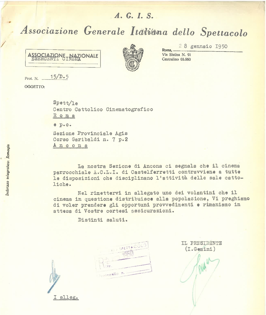 Lettera di Italo Gemini, presidente dell'Associazione generale italiana dello spettacolo - AGIS, al Centro cattolico cinematografico - CCC