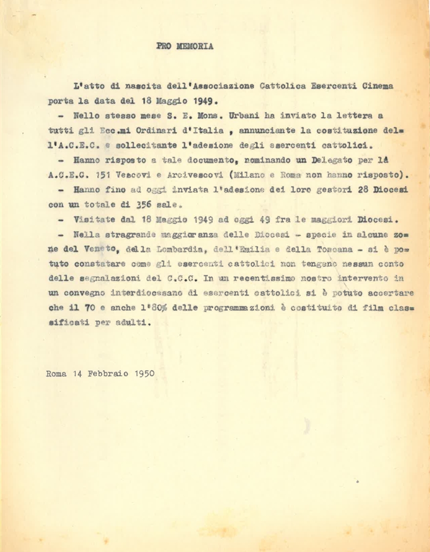 Nota sulla storia dell'ACEC recante una ricostruzione cronologica delle principali tappe e attività svolte dall'Associazione dal 18 maggio 1949 al 20 ottobre 1950