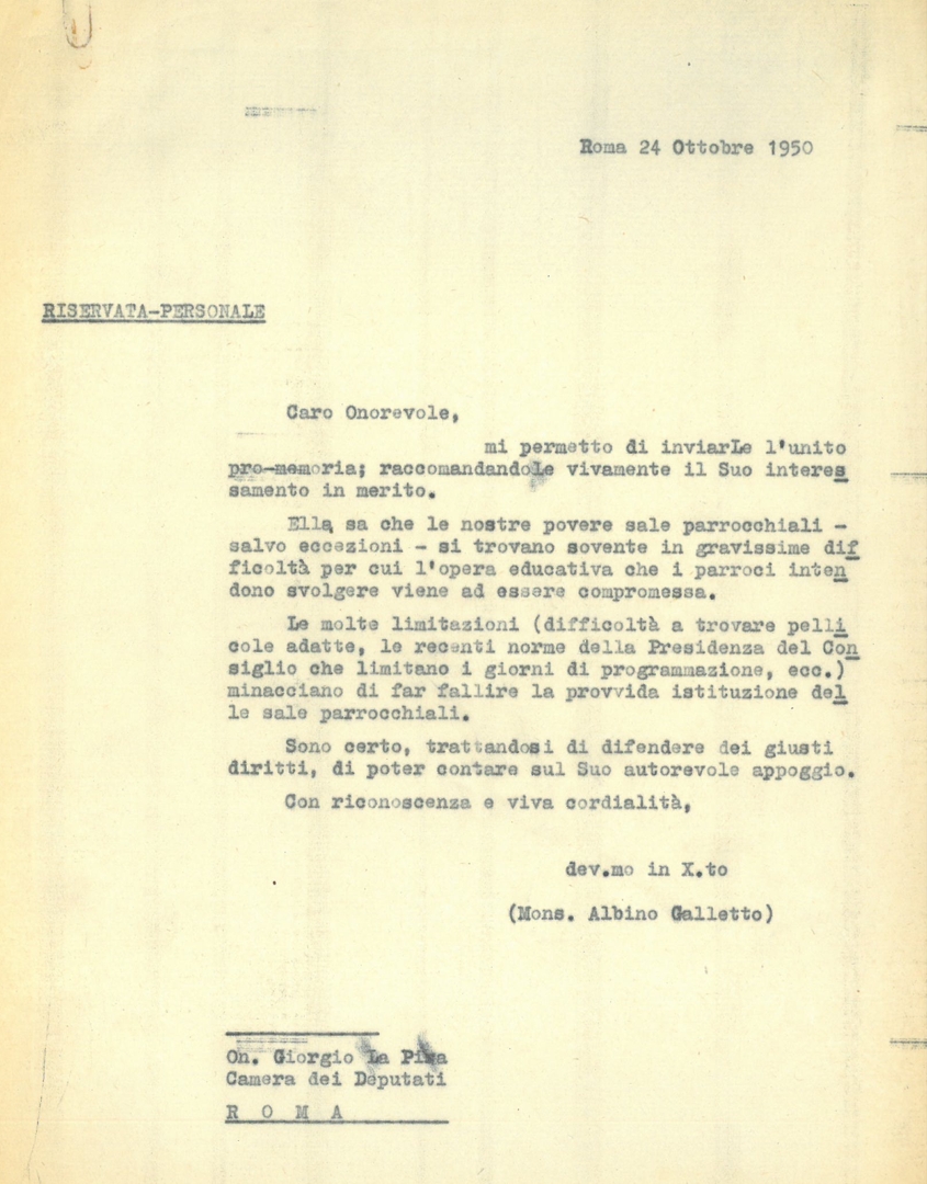 Lettera di mons. Albino Galletto, consulente ecclesiastico dell'Ente dello spettacolo, all'on. Giorgio La Pira