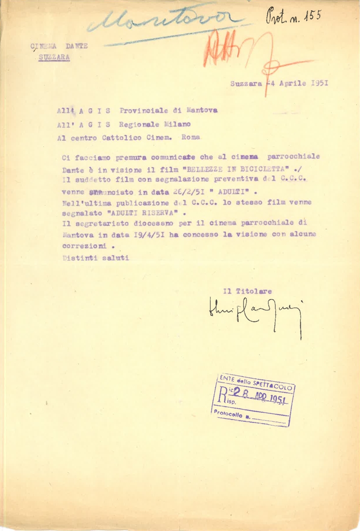 Lettera della direzione del cinema Dante di Suzzara in provincia di Mantova all'AGIS provinciale di Mantova, all'AGIS regionale di Milano e al Centro cinematografico cattolico - CCC