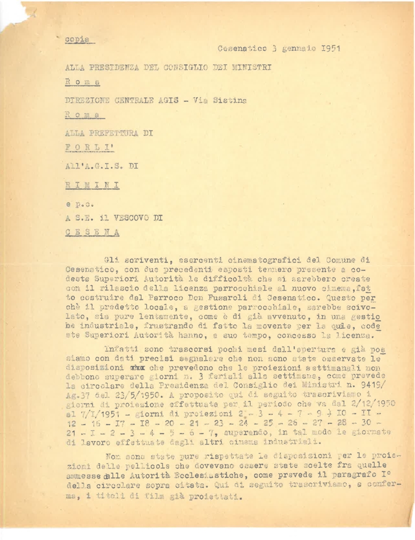 Lettera degli esercenti cinematografici del comune di Cesenatico in provincia di Forlì alla Presidenza del consiglio dei ministri e alla Direzione centrale dell'Associazione generale italiana dello spettacolo - AGIS
