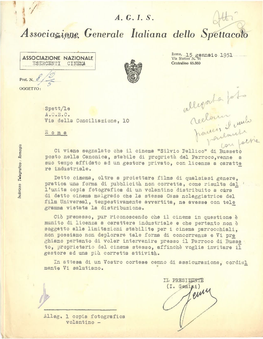 Lettera di Italo Gemini, presidente dell'Associazione generale italiana dello spettacolo - AGIS, alla presidenza dell'ACEC