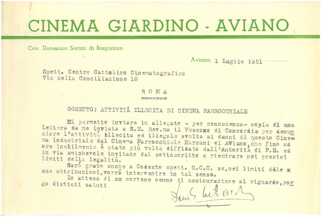 Lettera della direzione del cinema Giardino di Aviano in provincia di Pordenone al Centro cattolico cinematografico - CCC