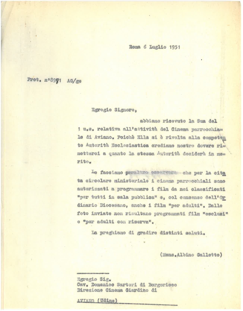 Lettera di mons. Albino Galletto, consulente ecclesiastico dell'Ente dello spettacolo, alla direzione del cinema Giardino di Aviano in provincia di Pordenone