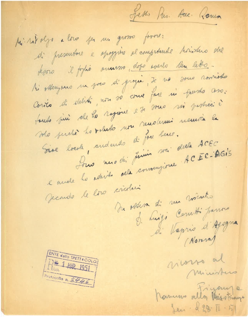 Lettera di don Luigi Cerutti, parroco di Vaprio D'Agogna in provincia di Novara, alla presidenza dell'ACEC