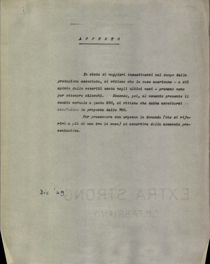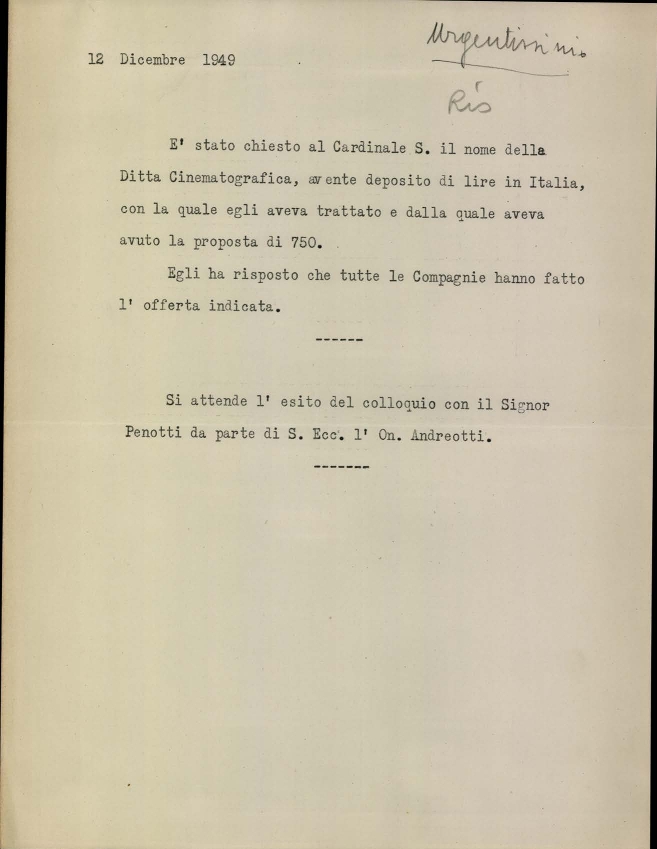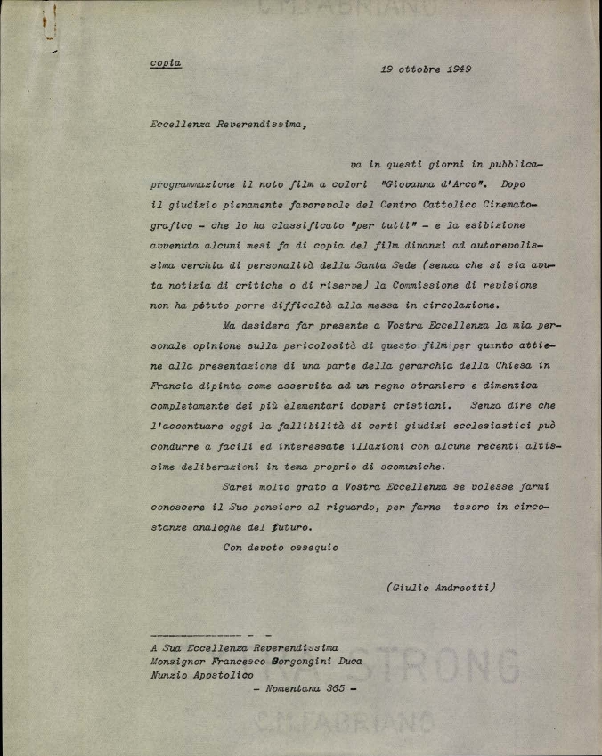 Lettera del nunzio apostolico Francesco Borgongini Duca all'on. Giulio Andreotti, sottosegretario di Stato alla presidenza del consiglio