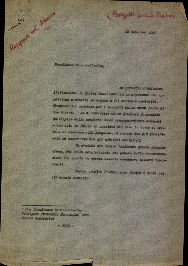 Lettera non firmata indirizzata al nunzio apostolico Francesco Borgongini Duca