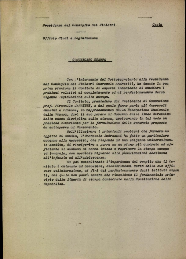 Comunicato stampa dell'Ufficio studi e legislazione della Presidenza del consiglio dei ministri