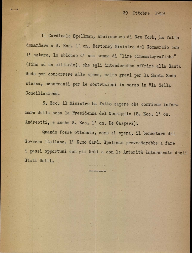 Comunicazioni in merito ad agevolazioni economiche per la Santa Sede provenienti da parte dell'arcivescovo di New York Francis Spellman