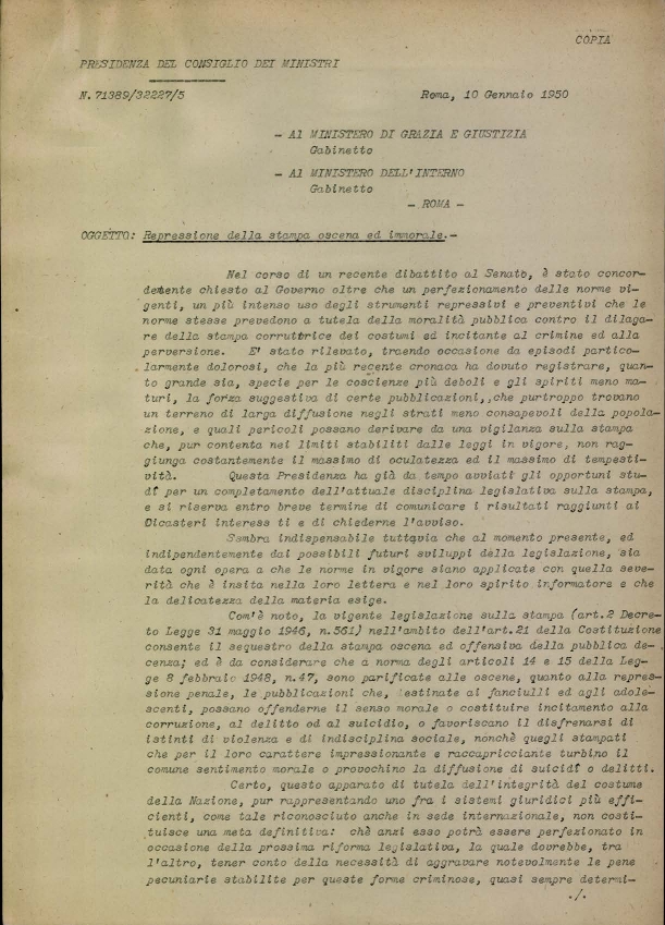 Lettera dell'on. Alcide De Gasperi, presidente del consiglio dei ministri, ai ministri di grazia e giustizia e dell'interno