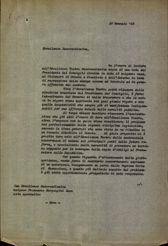 Lettera dell'on. Giulio Andreotti, sottosegretario di Stato alla presidenza del consiglio, al nunzio apostolico Francesco Borgongini Duca