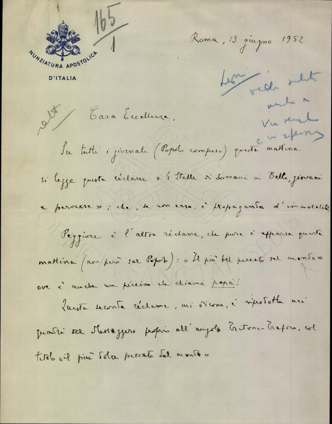 Lettera del nunzio apostolico mons. Francesco Borgongini Duca a destinatario non indicato