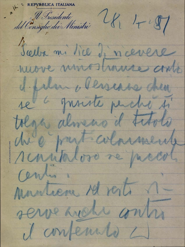 Appunto di Nicola De Pirro, direttore generale dello spettacolo, per l'on. Giulio Andreotti, sottosegretario di Stato alla presidenza del consiglio dei ministri
