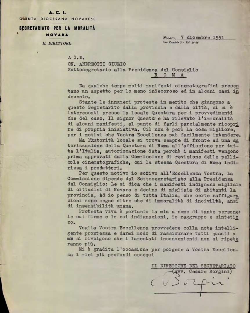 Lettera di Cesare Borgini, direttore del Segretariato per la moralità di Novara, all'on. Giulio Andreotti, sottosegretario di Stato alla presidenza del consiglio dei ministri