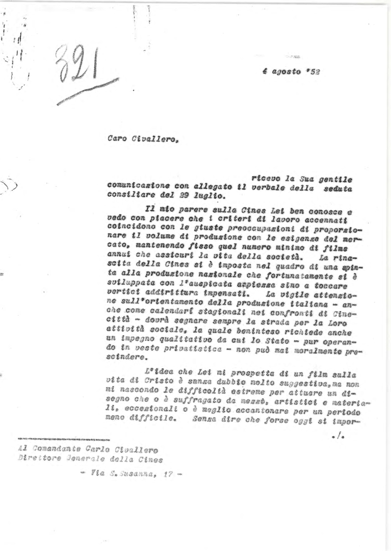 Lettera dell'on. Giulio Andreotti, sottosegretario di Stato alla presidenza del consiglio dei ministri, a Carlo Civallero, direttore generale della Cines