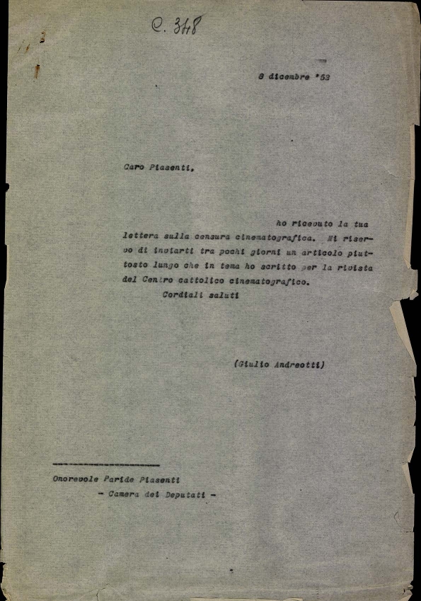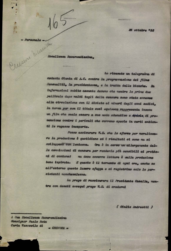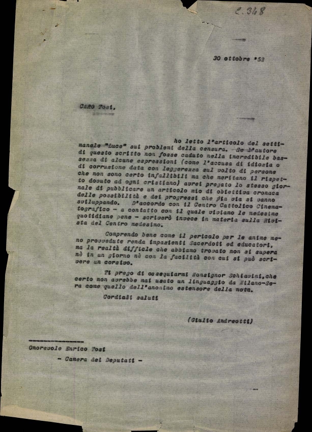 Lettera dell'on. Giulio Andreotti, sottosegretario di Stato alla presidenza del consiglio dei ministri, a mons. Albino Galletto, consulente ecclesiastico del Centro cattolico cinematografico - CCC
