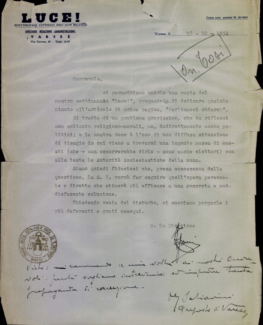 Lettera della direzione del settimanale "Luce!" a destinatario non indicato