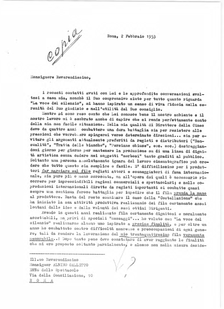 Lettera di Carlo Civallero, direttore della Cines, a mons. Albino Galletto, consulente ecclesiastico dell'Ente dello spettacolo