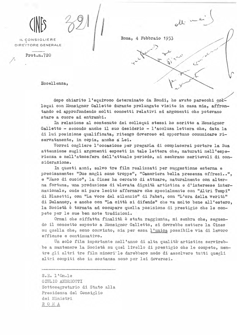 Lettera di Carlo Civallero, direttore della Cines, all'on. Giulio Andreotti, sottosegretario di Stato alla presidenza del consiglio dei ministri