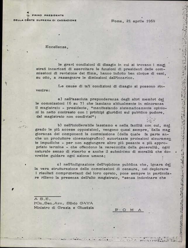 Lettera di Silvio Tavolaro, primo presidente della Corte suprema di cassazione, all'on. Silvio Gava, ministro di grazia e giustizia
